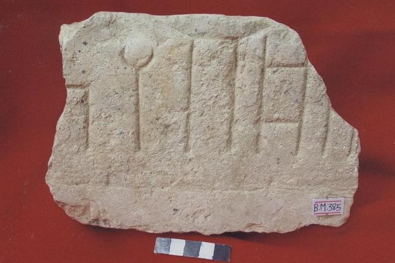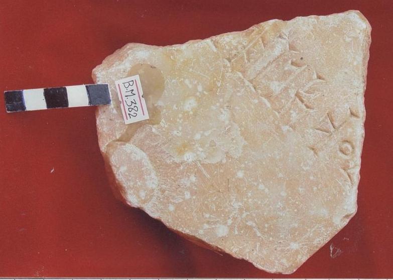 قطعة من حجر الجيري عبارة عن نقش مكسور من الجوانب والاعلى ,على الواجهة بقايا سطر بخط بالمسند واجزاء من حروف نصه :..