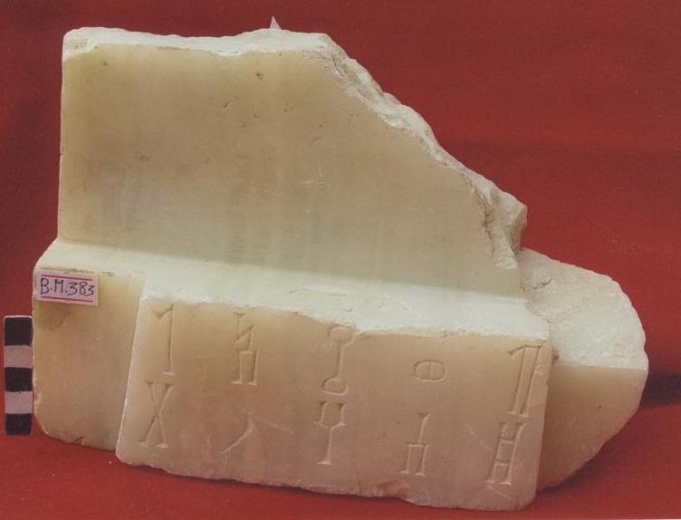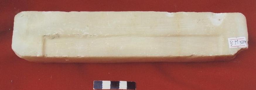 قطعة من حجر الرخام الابيض عبارة عن لوحة اسفل القطعة من الامام بها بروز وفي وسطة وبروز اخر على واجهتة سطرين بخط المسند نصه :.