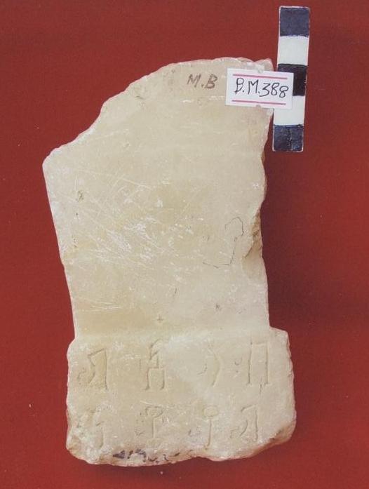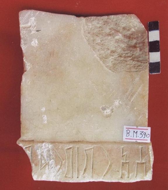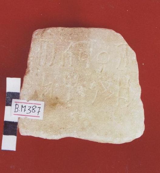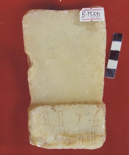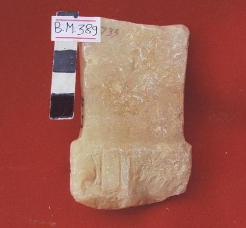 قطعة من حجر الرخام عبارة عن قاعدة مكسور من الجوانب والخلف ,الواجهة مصقولة عليها كتابة بالخط المسند نصها :...