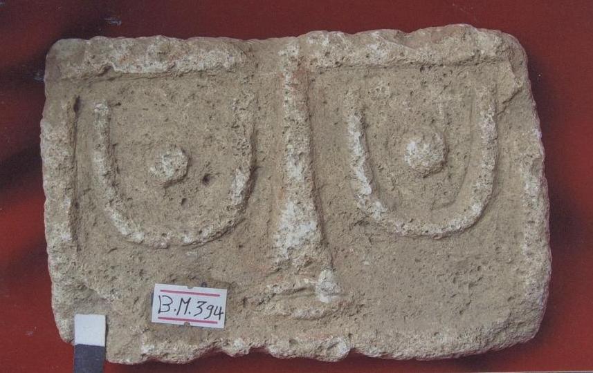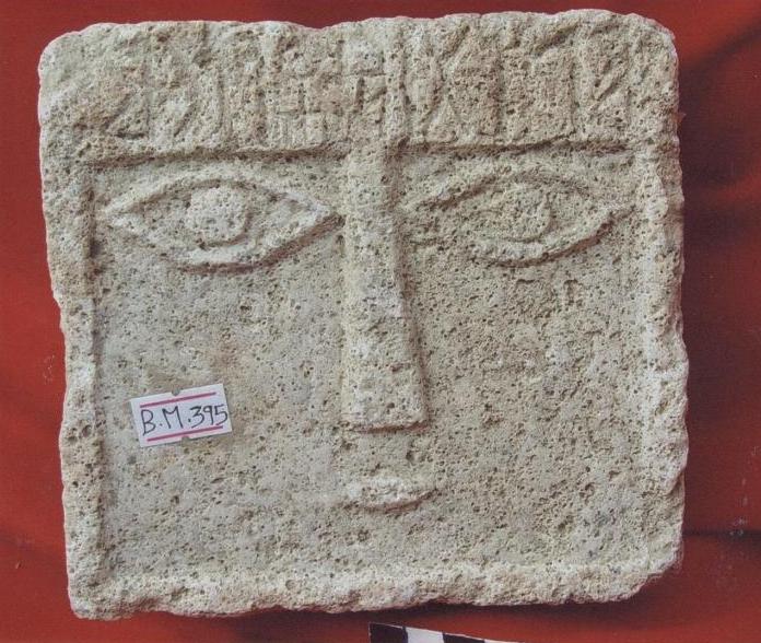 قطعة من حجر الجيري مربعة الشكل عبارة عن شاهد ,واجهة القطعة عليها نحت لوجه ادمي ,العيون معمولة بشكل حدوه الفرس في وسطها بروز ,الانف بارز الشفاه بارزه غير منطبقة على بعضها ,القطعة مؤاطرة على الحواف شطوف بسيطة .