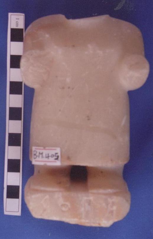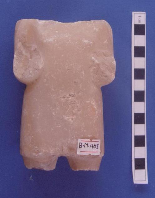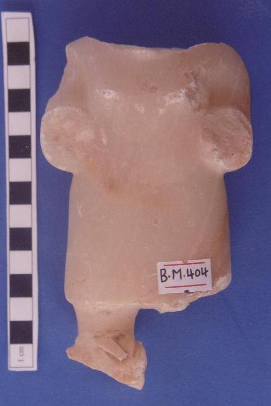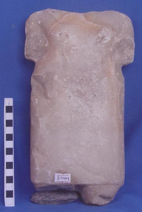 قطعة من حجر الرخام عبارة عن تمثال لآدمي في وضع واقف ,الايدي مكسورة ومفقودة ,يوجد شطف بسيط البدن بالجانب الأيسر ,من الامام والخلف الثديين ممثلة ببروز بسيط الرأس ايضاُ مكسور ومفقود