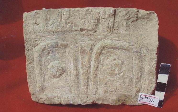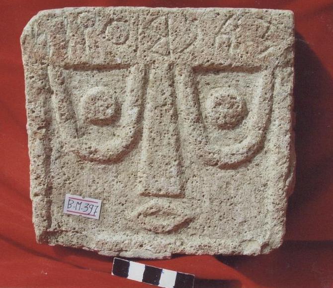 قطعة من الحجر الجيري ,واجهتها عليها نحت لوجة آدمي ممثله في العيون والانف فقط ,العيون بشكل حذوه الفرس بداخله بروز الانف مفقود ,الوجه متأكل القطعة مؤطره
