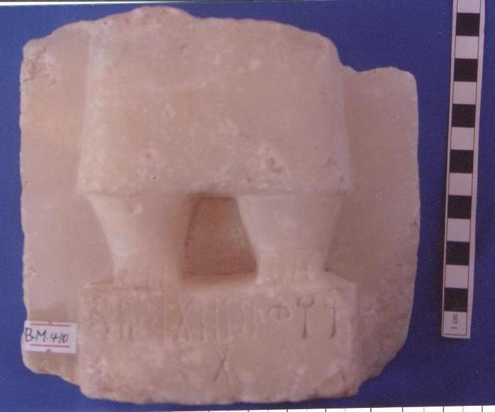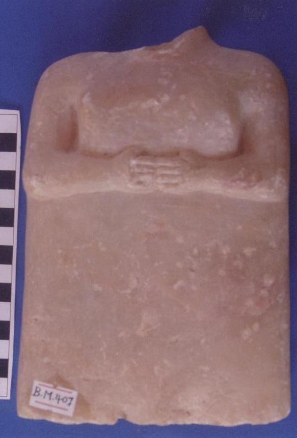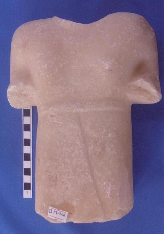 قطعة من حجر الرخام عبارة عن تمثال لأمراءة ,الرأس مكسور ومفقود ,الرقبة ممثله مستديرة ,الثديين ممثلة بارزة الأيدي غير ممثله ,الأرجل غير ممثله