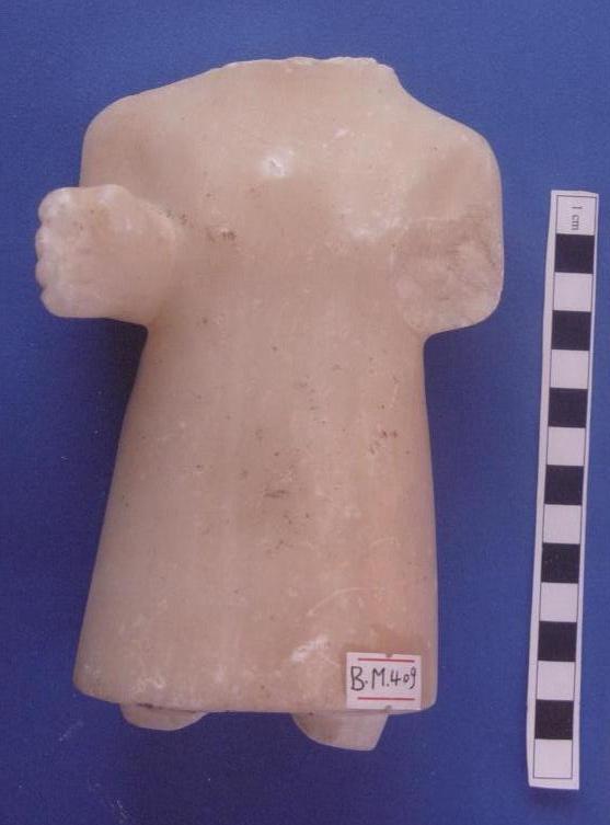 قطعة من حجر الرخام عبارة عن تمثال لآدمي في وضع واقف ,الرأس مكسور ومفقود الأيدي ممثله بجانب البدن وممدودة الى الأمام ,اليد اليسرى للتمثال مكسورة من المعضد ومفقودة ,اسفل البدن بروز بسيط ربما يمثل الأرجل احداها به شطف الصدر بارز قليلاً