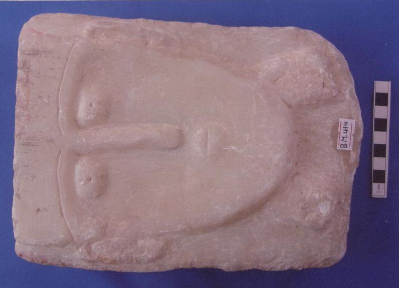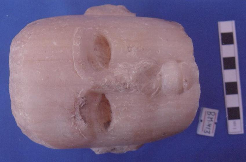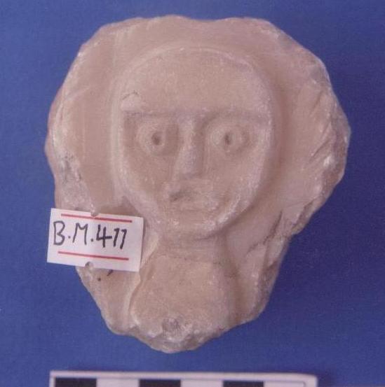 قطعة من حجر الرخام عبارة عن وجه آدمي شبه مستدير ,العينين ممثله محفورة لوزية الشكل ,الأنف ممثل عليه كسور مفقودة