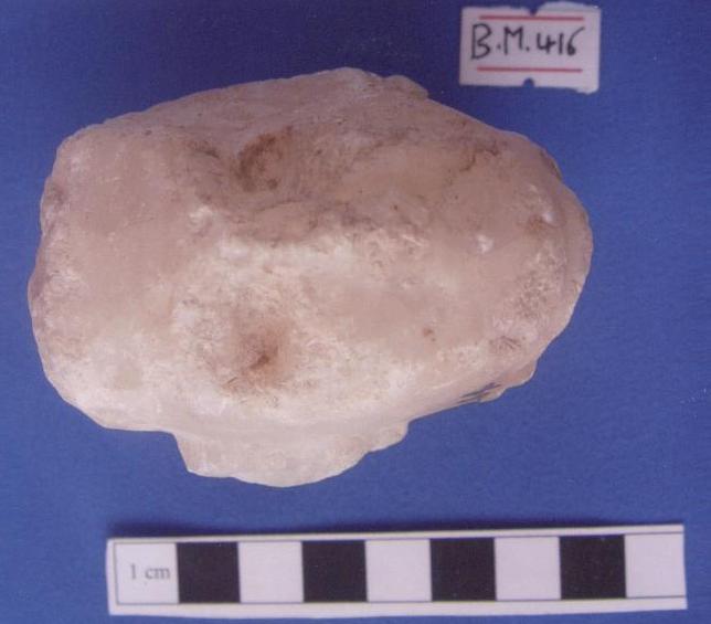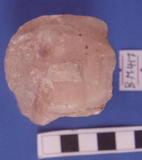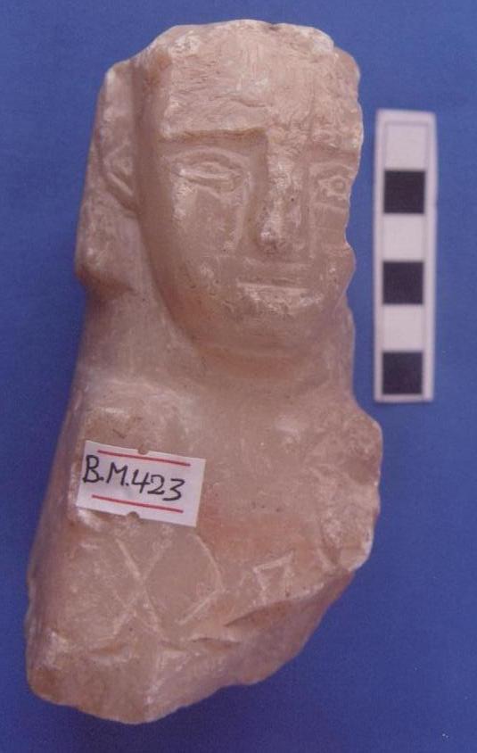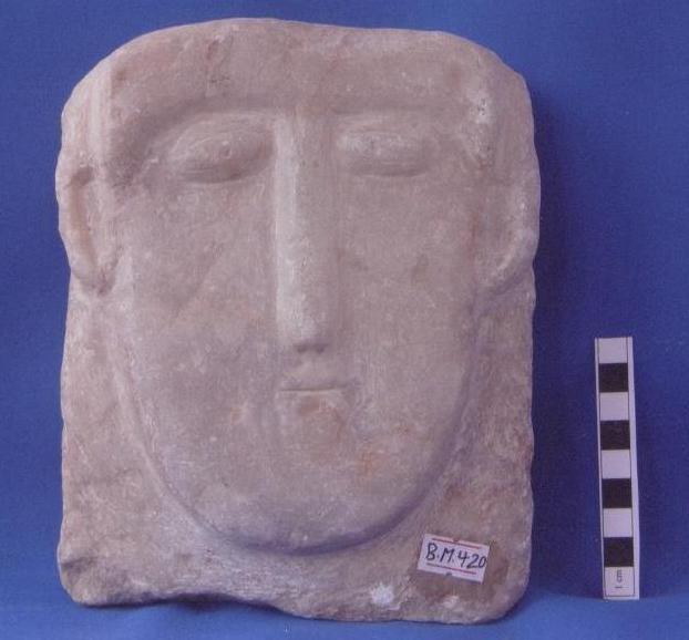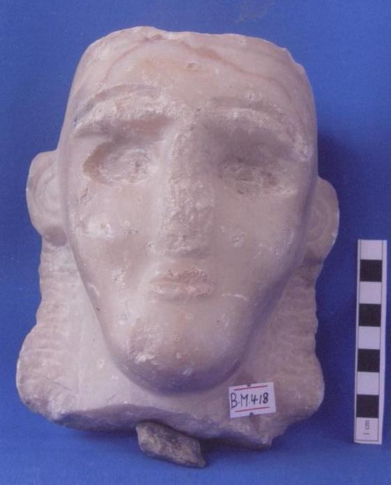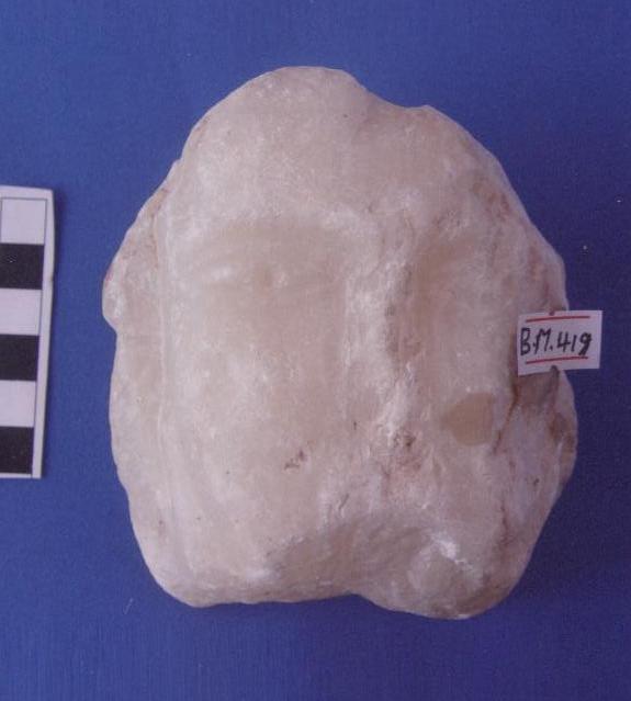 قطعة من حجر الرخام عبارة عن وجه آدمي صغير العينين ممثله محفورة لوزية الشكل ,الأنف بارزز الشفاه ممثله ببروز يوجد شطف أعلى الوجه بالجانب الأيمن خلف الوجه كسر مفقود