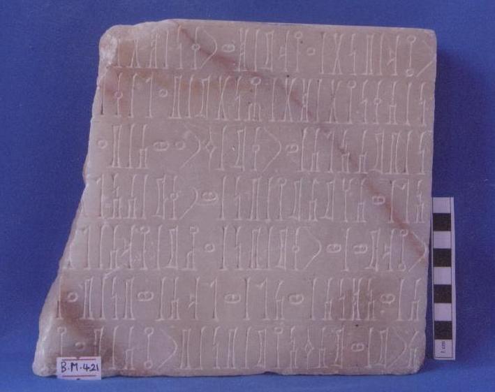 لوحة من حجر الرخام مربعة الشكل تقريباً نحت على واجهتها وجه آدمي بارز ,العينين ممثله لوزية الشكل بارزة ,,الأنف بارز وطويل ,الشفاه ممثله منطبقة ,الاذنين ممثلة بارزة ,الوجه عموماً مصقول