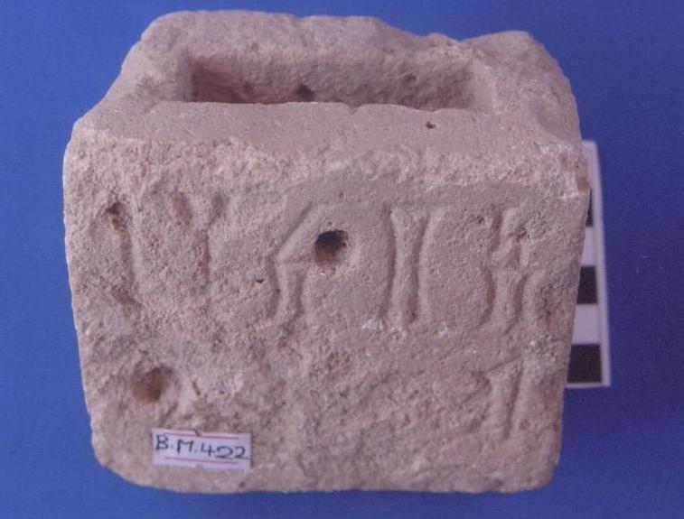 قطعة من حجر البلق عبارة عن قاعدة تمثال مربعة الشكل واجهتها كتابة بخط المسند مكونه من سطرين .