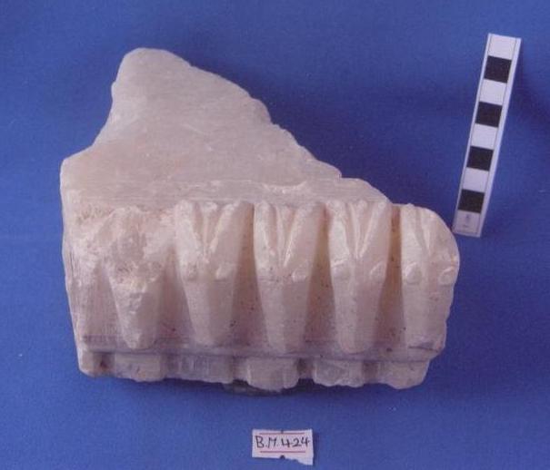 قطعة من الحجر الرخام عبارة عن افريز مكسور من الجوانب والخلف بشكل مائل على واجهتة الامامية نحت لخمسة رؤوس وعول الرأس ,الرأس الخامس العيون والقرون مكسورة ومفقودة
