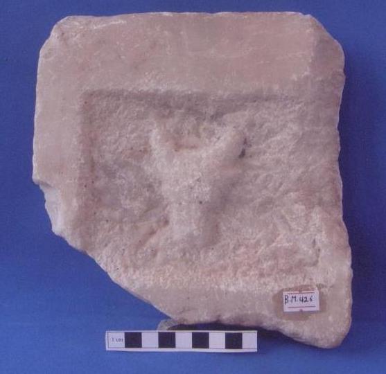 قطعة من الحجر الرخام عبارة عن لوحة مربعة الشكل واجهتها نحت بارز لوجه ثور ملامحة مطموسة , القرون ممثله القطعة مكسورة ومفقودة من الجانب الايسر ,وكذلك من اسفل الجانب الايمن بشكل مائل خلفية القطعة غير مصقولة