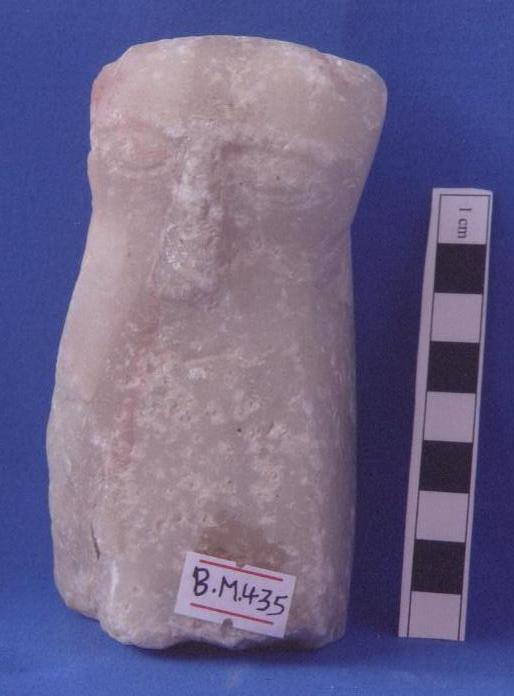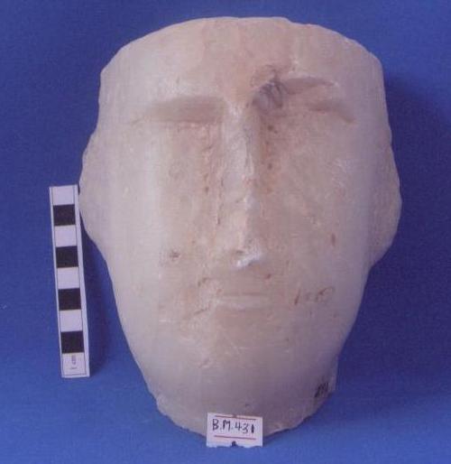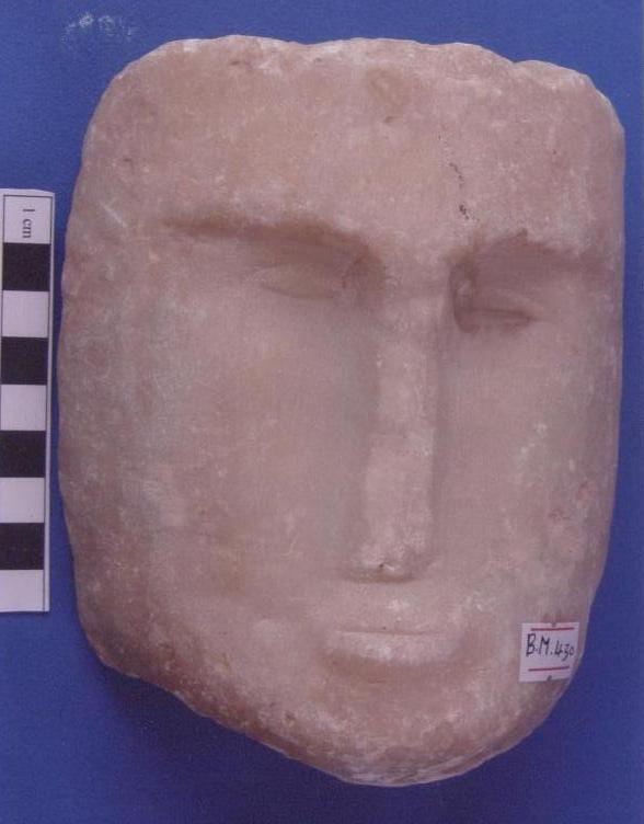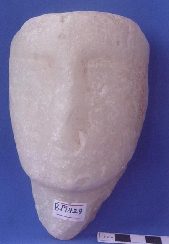 قطعة من الحجر الرخام عبارة عن وجه آدمي العيون لوزيه صغيرة ,الانف مفلطح بارز قليلاً ,الشفاة بارزة