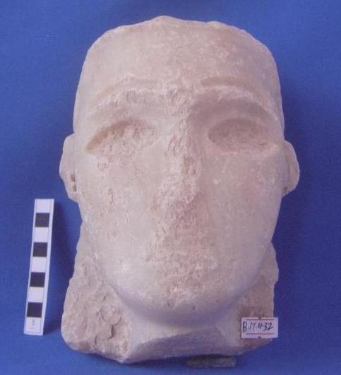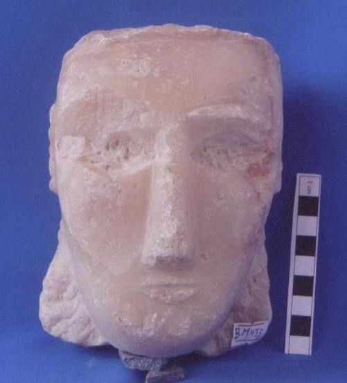 قطعة من الحجر الرخام عبارة عن راس آدمي ملامحة ممثله ,العيون لوزية بشكل خط غائر ,الانف بارزة مفلطحة فتحات الأنف ممثله