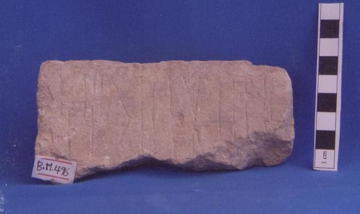 قطعة من حجر البلق مستطيلة الشكل مكسورة من الأسفل كسور بسيطة ومفقودة على واجهتها نقش بالمسند مكون من سطر واحد بالخط الغائر نصه ..