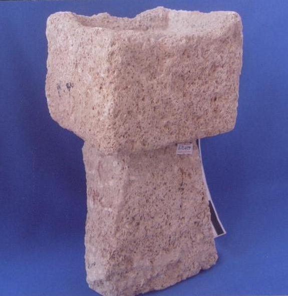 قطعة من الحجر الرملي عبارة عن مبخرة مكعبة الشكل ترتكز على قاعدة هرمية الشكل مكسورة من الخلف بشكل مائل حتى الاسفل تضيق من الاعلى وتتسع من الاسفل على حواف البدن شطوف مكسورة بسيطة