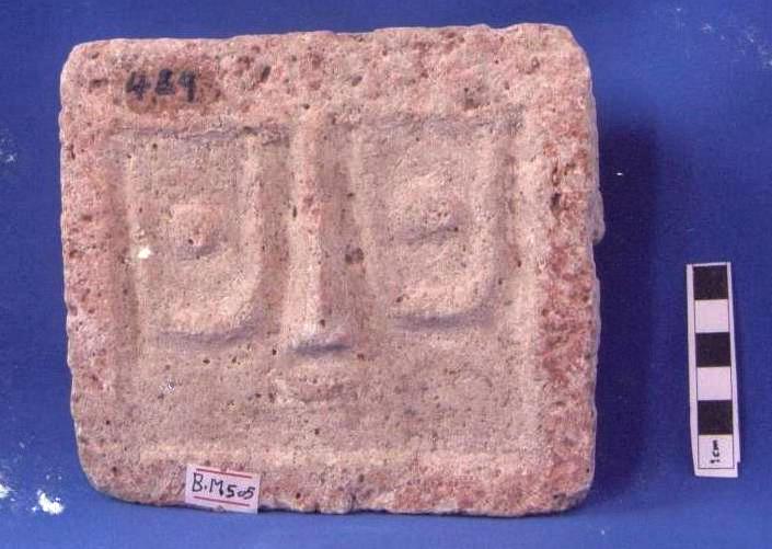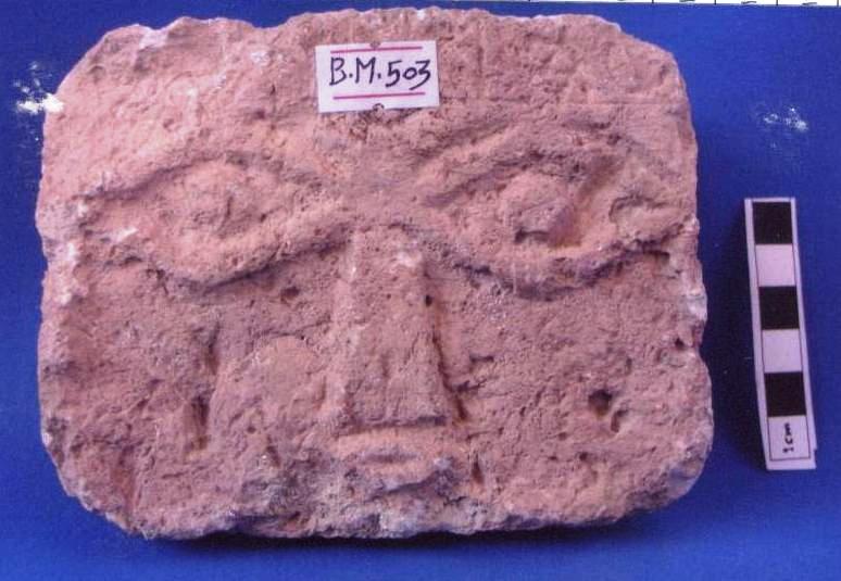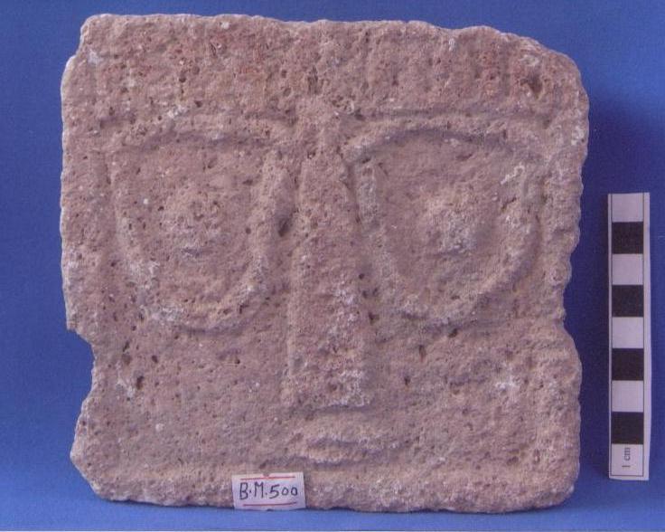 قطعة من الحجر الجيري تمثل شاهد قبر لوجة آدمي مربعة الشكل العيون لوزية ممثله بارزة الأنف مخروطي وبارز وكذا الشفاة بارزة لوزية