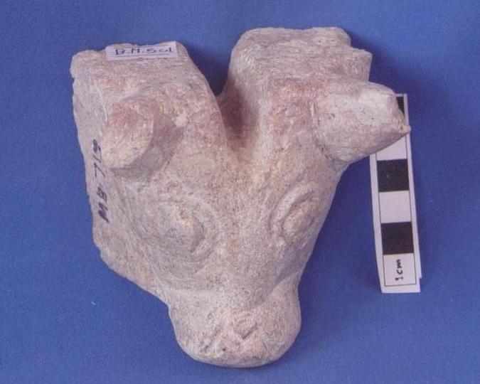 قطعة من الحجر الجيري تمثل رأس ثور واضح الملامح ,العيون ممثله ,القرن الأيمن به كسر من النصف والأيسر به شطف خفيف وهو عبارة عن نهاية مذبح