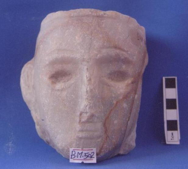 قطعة من الحجر الرخام تمثل رأس آدمي العيون لوزية ممثله ,الأنف به بعض الشطوف الاذن اليمنى ممثله اما الاذن اليسرى مع جزء من مؤخرة الرأس مفقود ,الشفاة ممثله