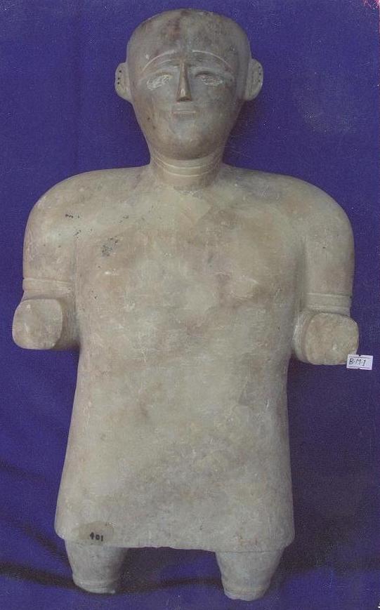 قطعه من حجر الرخام عباره عن تمثال لادمي واقف ,الاقدام والكفوف مكسوره ومفقوده ,ملامح الوجه واضحه ,العيون لوزيه الحواجب ممثله ,الانف بارز ,الانف ممثل بخط محزوز ,الاذنين ممثله وعلى كل اذن ثلاثه ثقوب ,اسفل الرقبه خطين محزوزين ,الايدي مظمومه على الجسم ,على الاقدام بروز دائري ,اعلى الراس مشذب خلفيتها بارزه من وسط البدن حتى الاسفل .
