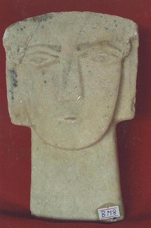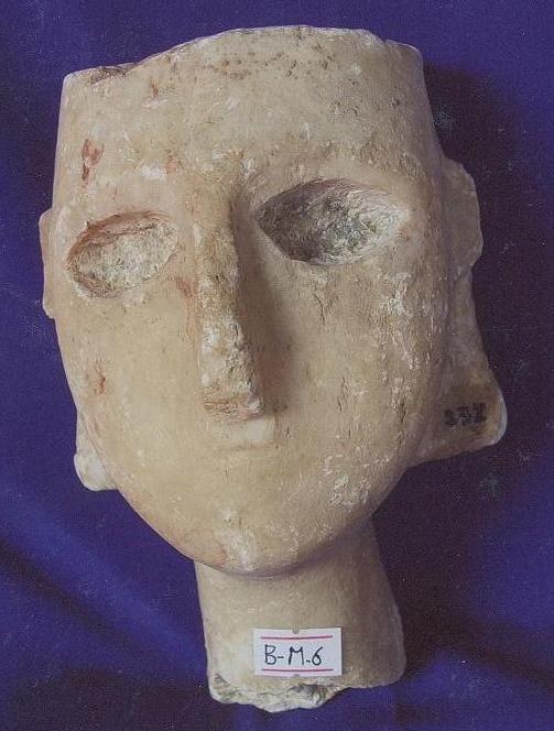 قطعه من الرخام بيضاء اللون عباره عن وجه ادمي مع الرقبه ملامح الوجه واضحه ,العيون لوزيه مفرغه ,الانف بارز مشطوف من الوسط ,الفم ممثل بخط محزوز ,الدقن ممثل ببروز ينتهي عند الاذنين ,الرقبه مسطحه ,خلفية الوجه غير مهذبه .
