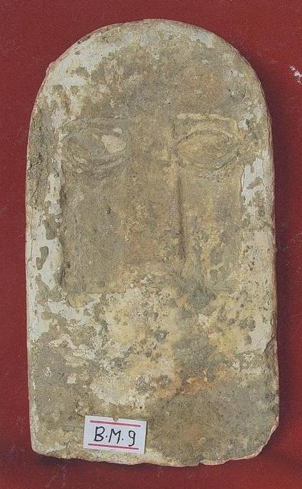 قطعه من الحجر الكلسي بيضاء اللون عباره عن شاهد قبر على واجهتها الاماميه نحت شبه بارز لوجه ادمي ملامحه مكتمله ,العيون لوزيه الانف مفلطح ,الحواجب والفم ممثله بخط غائر ,على القطعه شطوف صغيره ,حافتها العلويه مستديره .