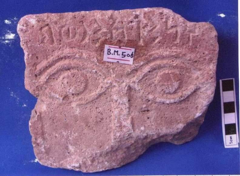 قطعة من الحجر الجيري تمثل شاهد لوجه آدمي مربعه الشكل ,الركن الأيسر مكسور ,والعيون ممثله لوزية بارزة مع بروز في الوسط بشكل دائري صغير ,الأنف طويل وبارز بشكل مخروطي,الحواجب ممثله وبارزة اما الشفاة مفقودة ,يوجد بها سطر من الكتابة بالخط المسند في الأعلى نصه ..
