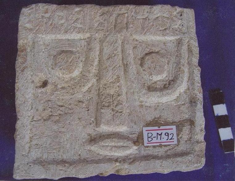قطعه من الحجر الجيري مستطيلة الشكل عباره عن شاهد قبر مثلث فيه العينين والحاجبين والانف والفم وكتب على الجبين احرف بالخط المسند والخلفيه غير مستويه .