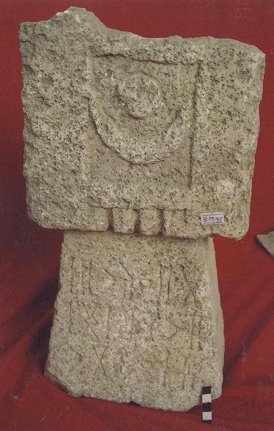 قطعه من الحجر الجيري عباره عن شاهد قبر مثلث فيه العينين والانف والفم بشكل بارز ،كتب على الجبين بخط المسند .