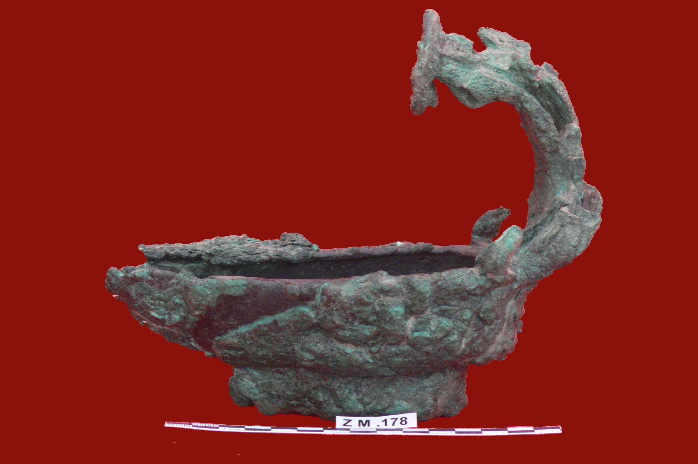 قطعه من البرونز عباره عن مسرجه بشكل قارب غلى امسرجه طبقة الباتينيا ,مقدمة المسرجه عند الحافه كسر مفقود ,يرتكز البدن على قاعده مثلثة الشكل مفرغه من الداخل عند طرفها كسر بسيط ,موخرته من الاعلى بروز مرتفع مقوس مفلطح من نهايته ,يوجد من نهاية البدن بروزين متقا