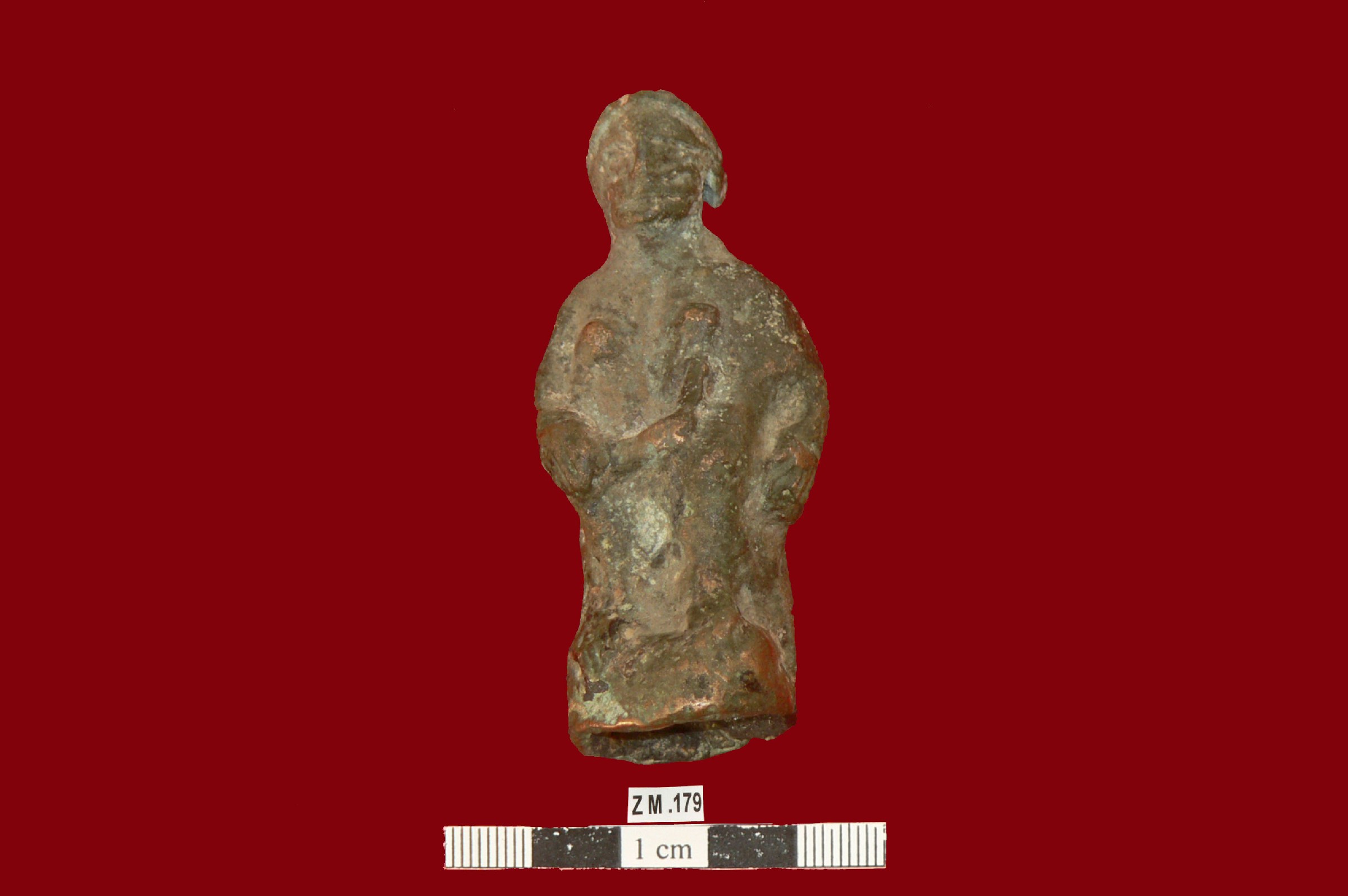 قطعه من البرونز عباره عن تمثال لادمي (امراءه) ربما انها تجلس على كرسي ,الثديين بارزين ,يوجد بروز يصل بين ركبتيها وينتهي اسفل الثدي والطرف الاخر عند الركبه اليمنى .اليدين ممثله اليد اليمنى ممدوده حتى الركبه اليمنى واليد اليسرى بكامل امتدادها الى الجانب ,اس