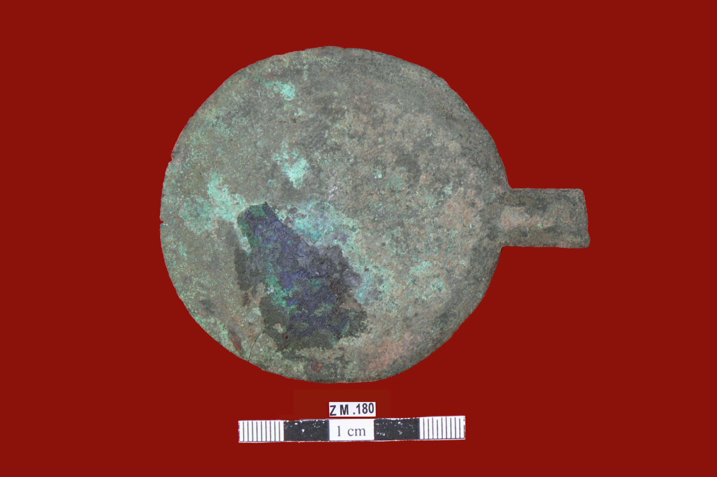 قطعه من البرونز عباره عن مرءاه مسطحه مستديره حافتها بارزه قليلا ,على احد جوانبها مقبض مكسور من الاعلى ومفقود .