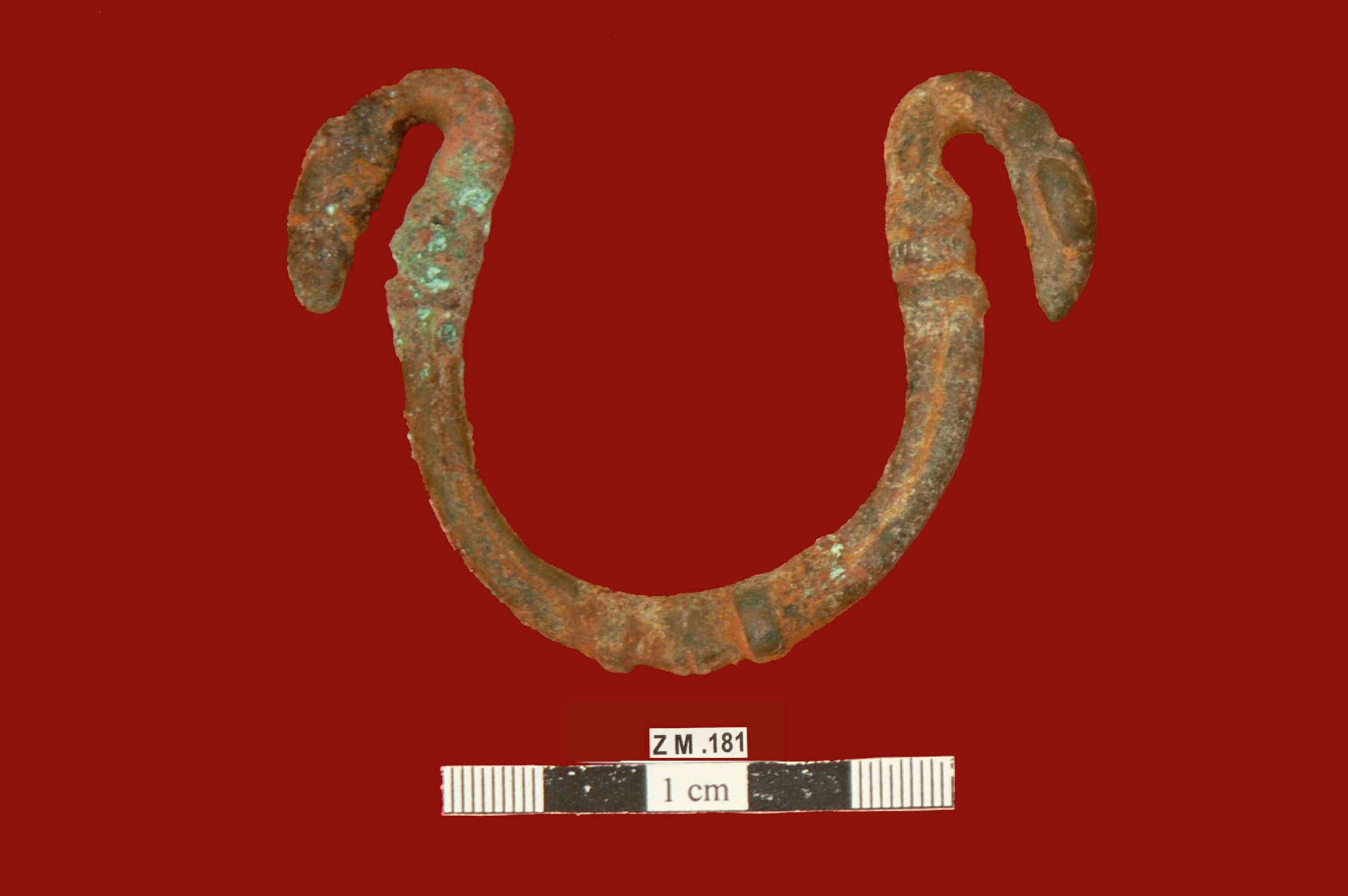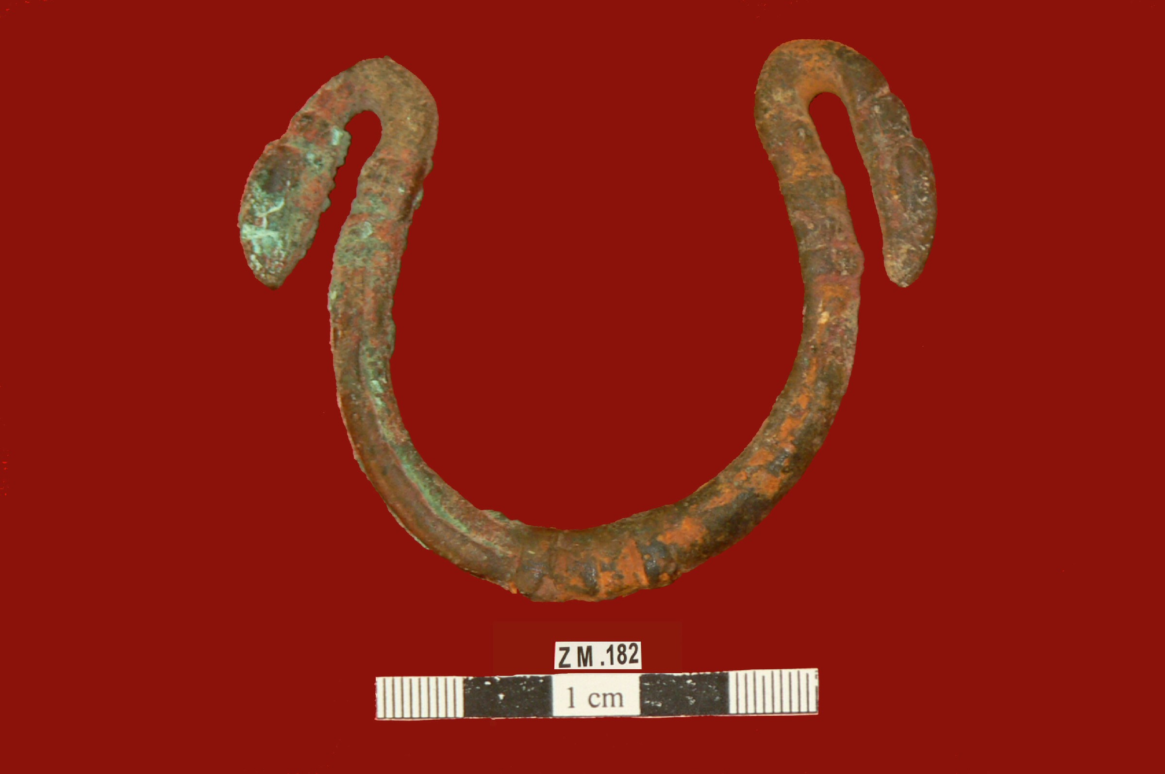 قطعه من البرونز عباره عن اسوره مقوسه اطرافها تنتهي براس ثعبان ,عليها بروزات دائريه .