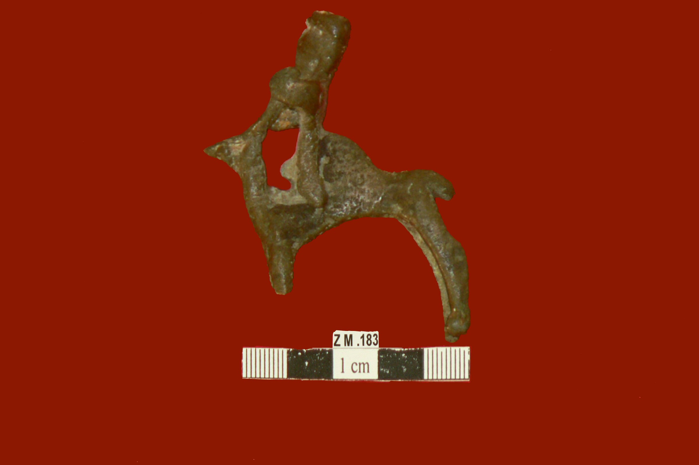 قطعه من البرونز صغيره شبه مسطحه عباره عن تمثال لجمل يمتطيه ادمي صغير ,يدي الجمل مكسوره ومفقوده ,الارجل ممثله مسطحه ,الذيل ممثل سميك الرقبه مستقيمه شبه مسطحه ,الوجه مدبب العين اليسرى ممثله مستديره بارزه قليلا السنام بارز ,بدن الادمي مسطح ,اليدين ممدوده الى