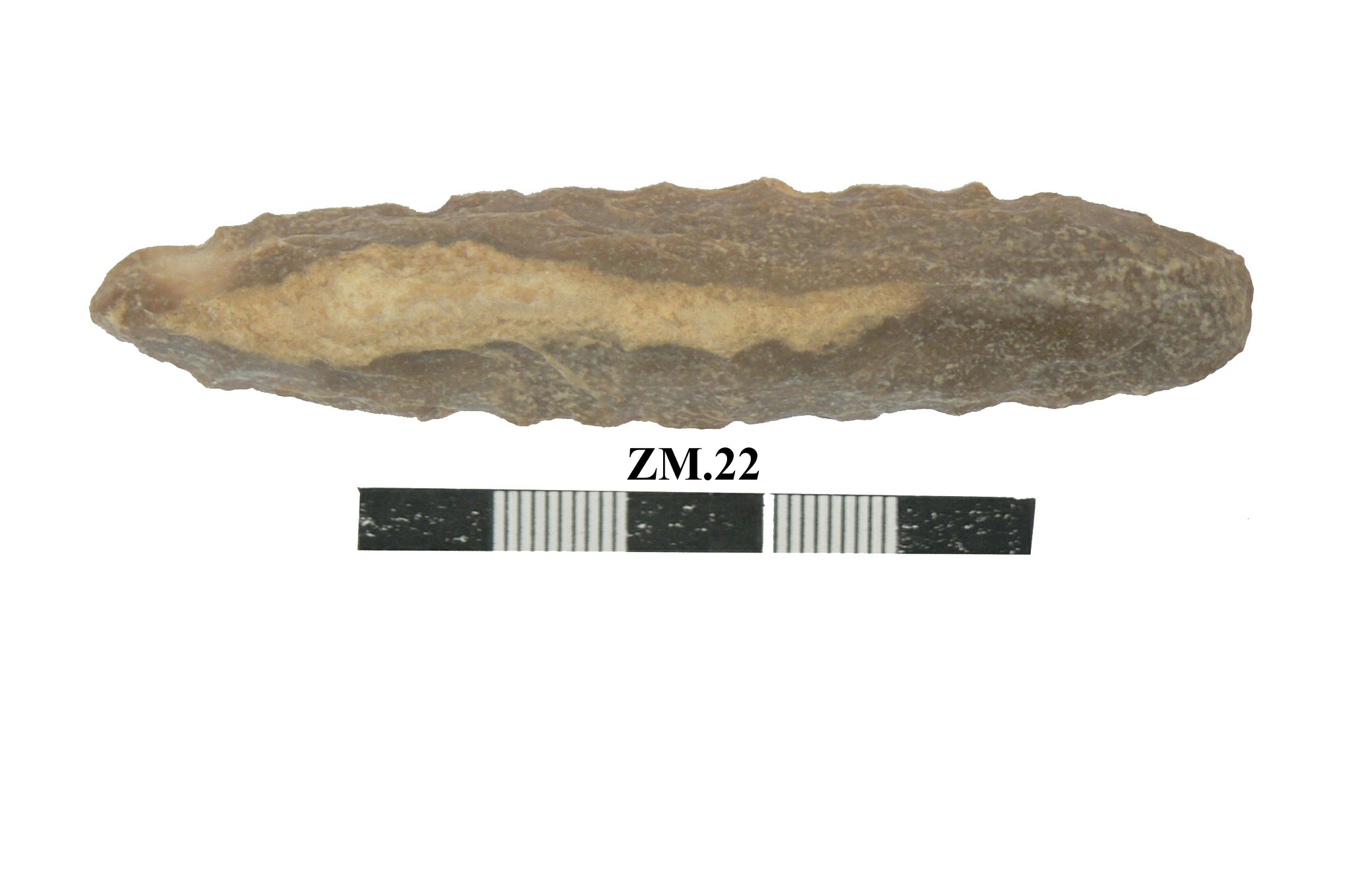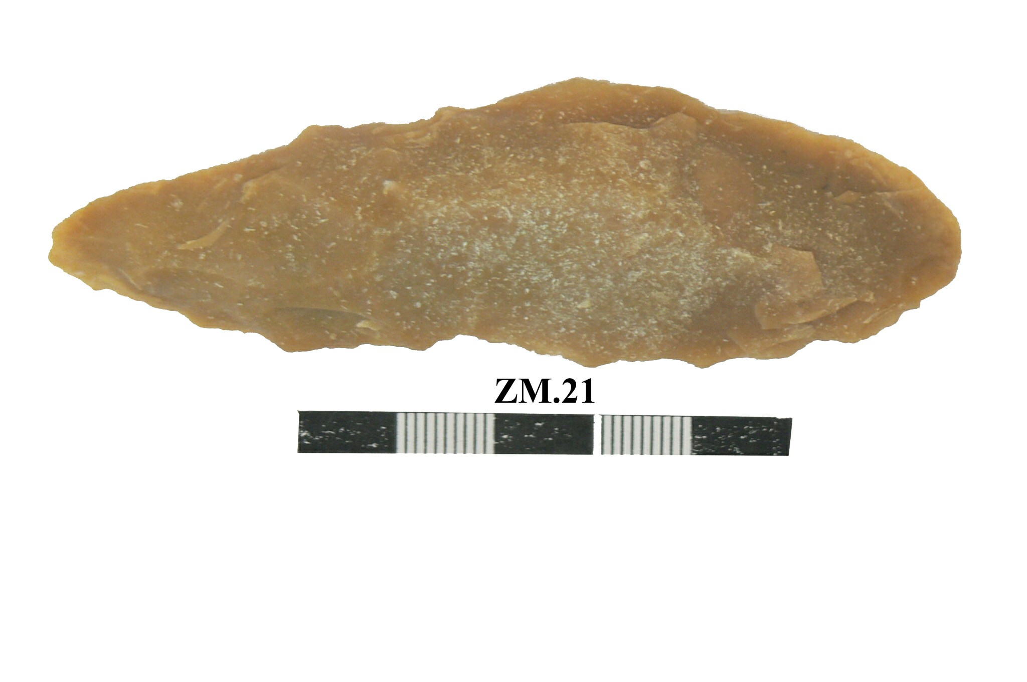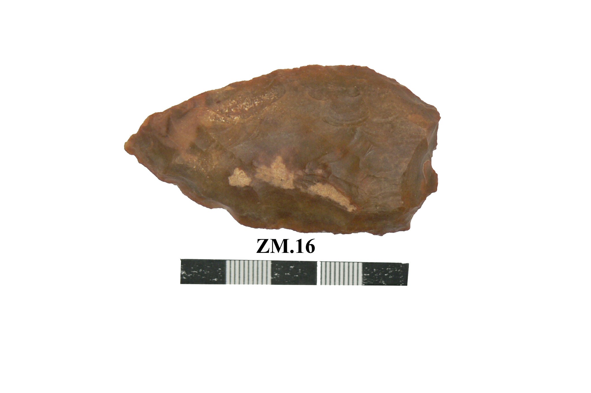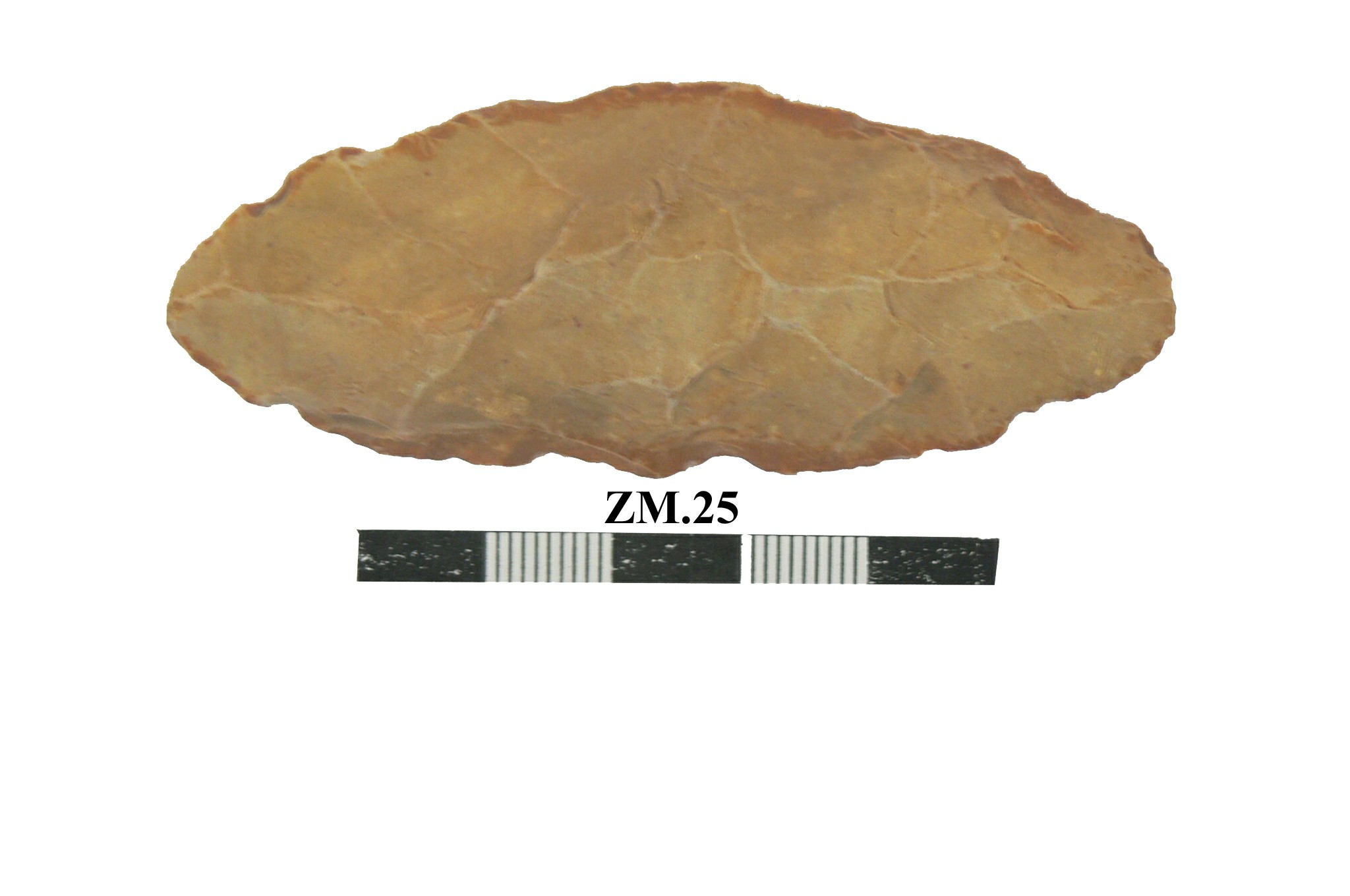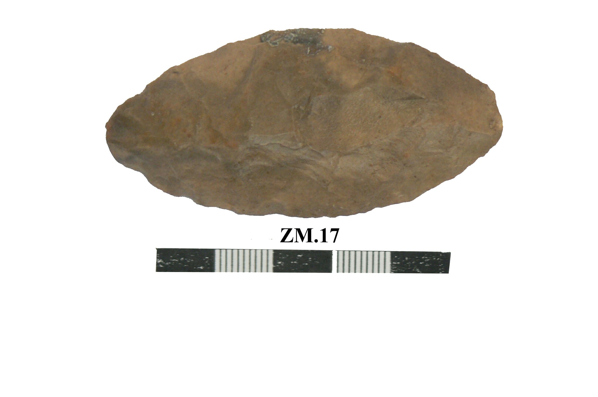 قطعه من حجر الصوان عباره عن مقشطه مصقوله احد طرفيها مدبب وحاد .القطعه مسطحه وبها في الاعلى ثلاث بقع صغيره قمحية اللون .