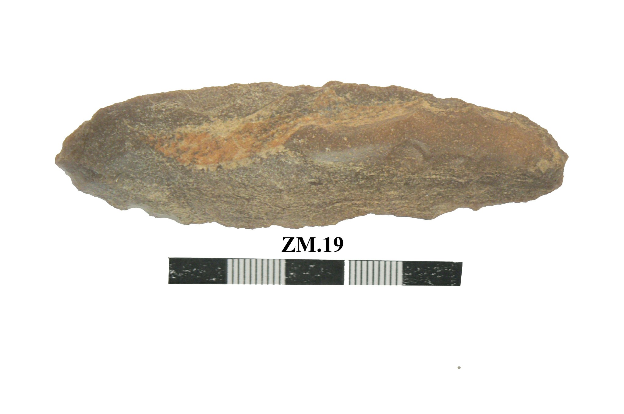قطعه من حجر الصوان عباره عن مقشطه حوافها مسننه ومدببه من الاطراف . القطعه مصقوله ومهذبه تضيق قليلا من احد الاطراف .
