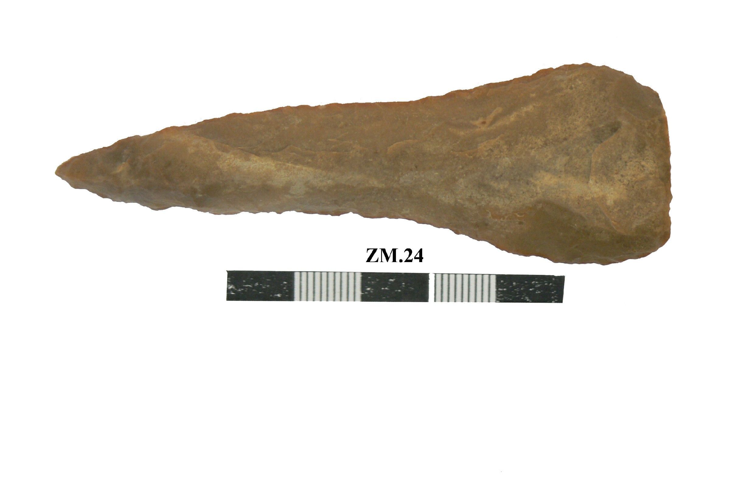 قطعه من حجر الصوان عباره عن مقشطه حوافها مسننه تتسع من احد الاطراف وتضيق من الطرف الاخر نهايته حاده . القطعه مصقوله ومهذبه .