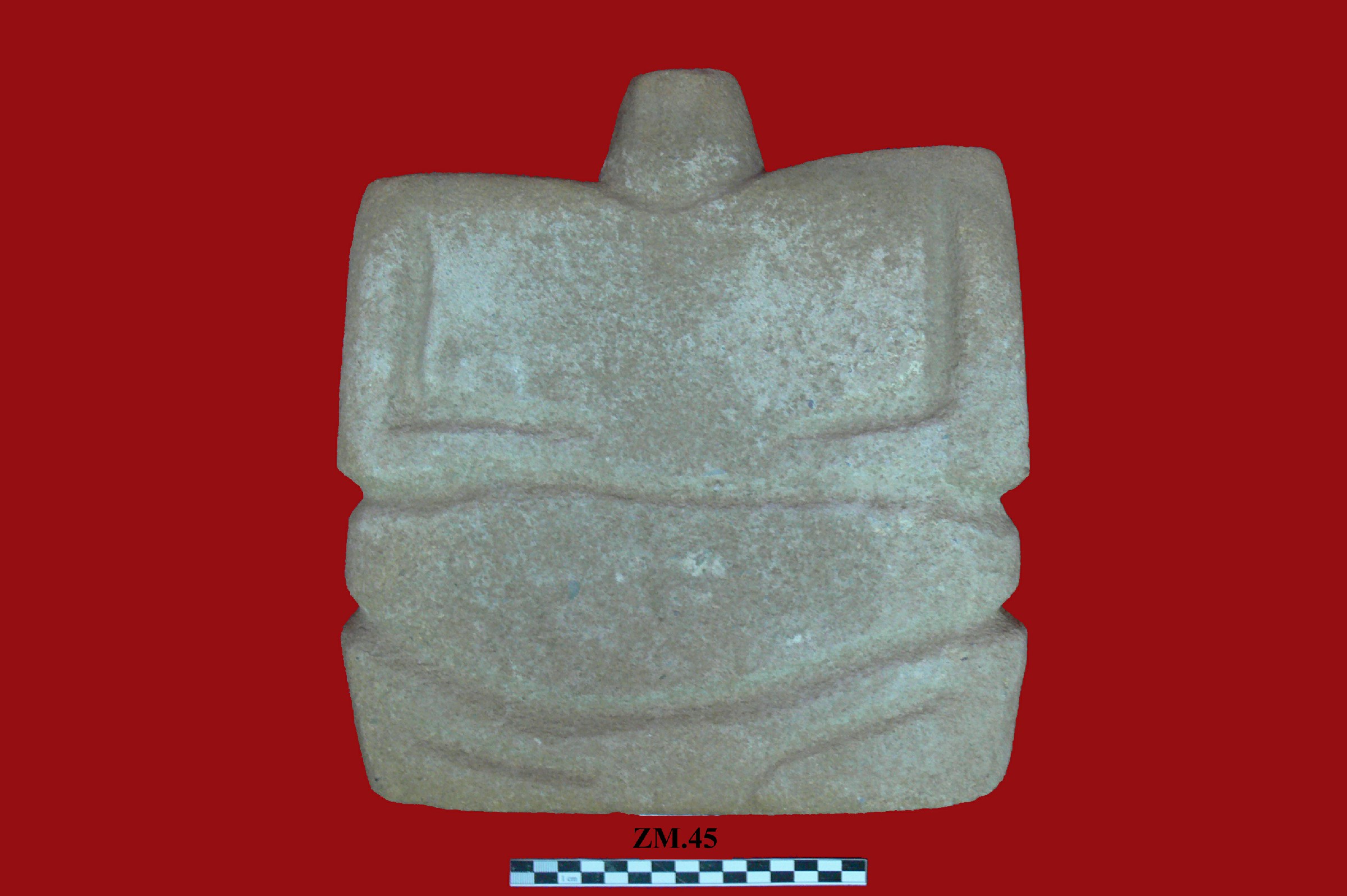 قطعه من الحجر الرملي عباره عن تمثال لادمي واقف ممثل بشكل بدائي ملامح الوجه ممثله بالانف الطولي . العينين والفم لم تمثل ,الايدي موضوعه على البطن مسطحه , الاصابع , لم تمثل , والارجل مثلت بشكل جانبي ,خلفية التمثال مصقوله تبين تفاصيل الايدي والارجل , للقطعه