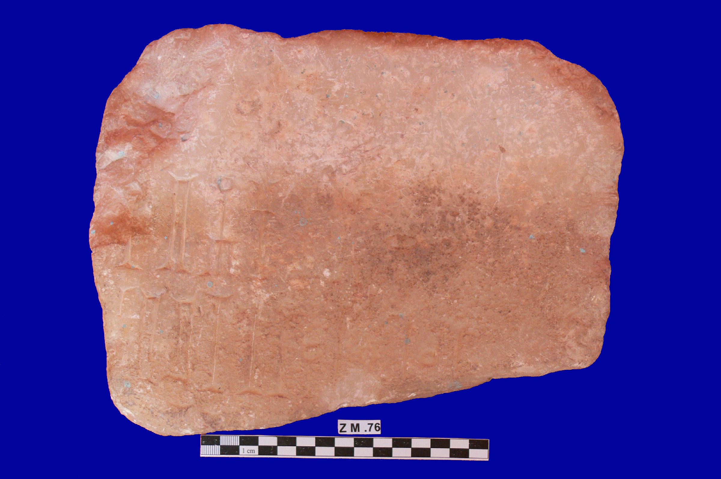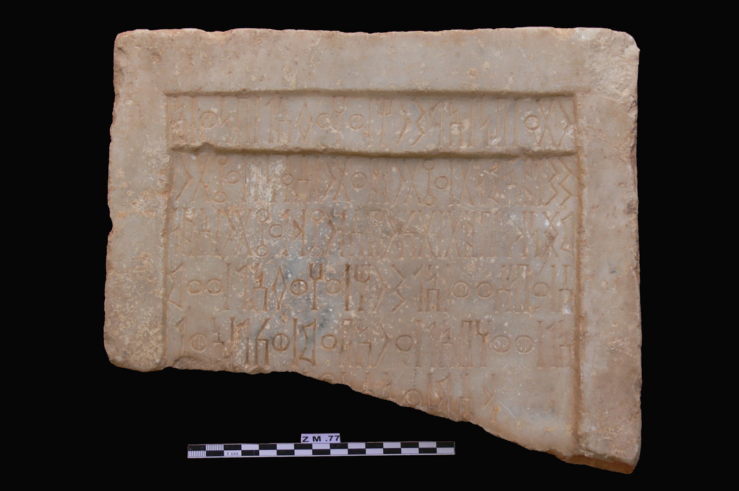 قطعه من حجر الرخام عباره عن لوحه مستطيلة الشكل موطره مكسوره من الاسفل بشكل مائل ومفقود , على واجهتها بقايا نقش بخط المسند الغائر مكون من سته اسطر