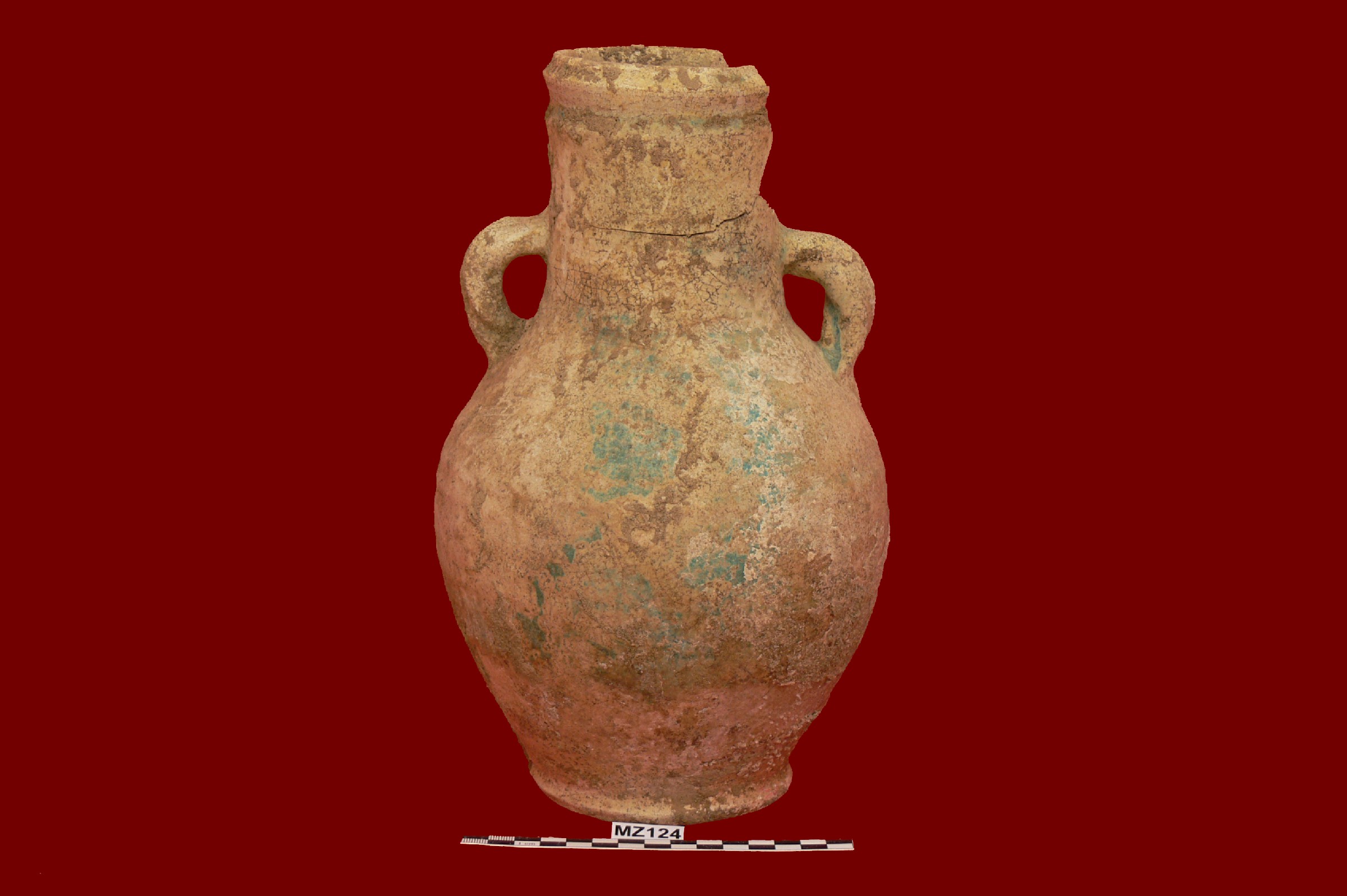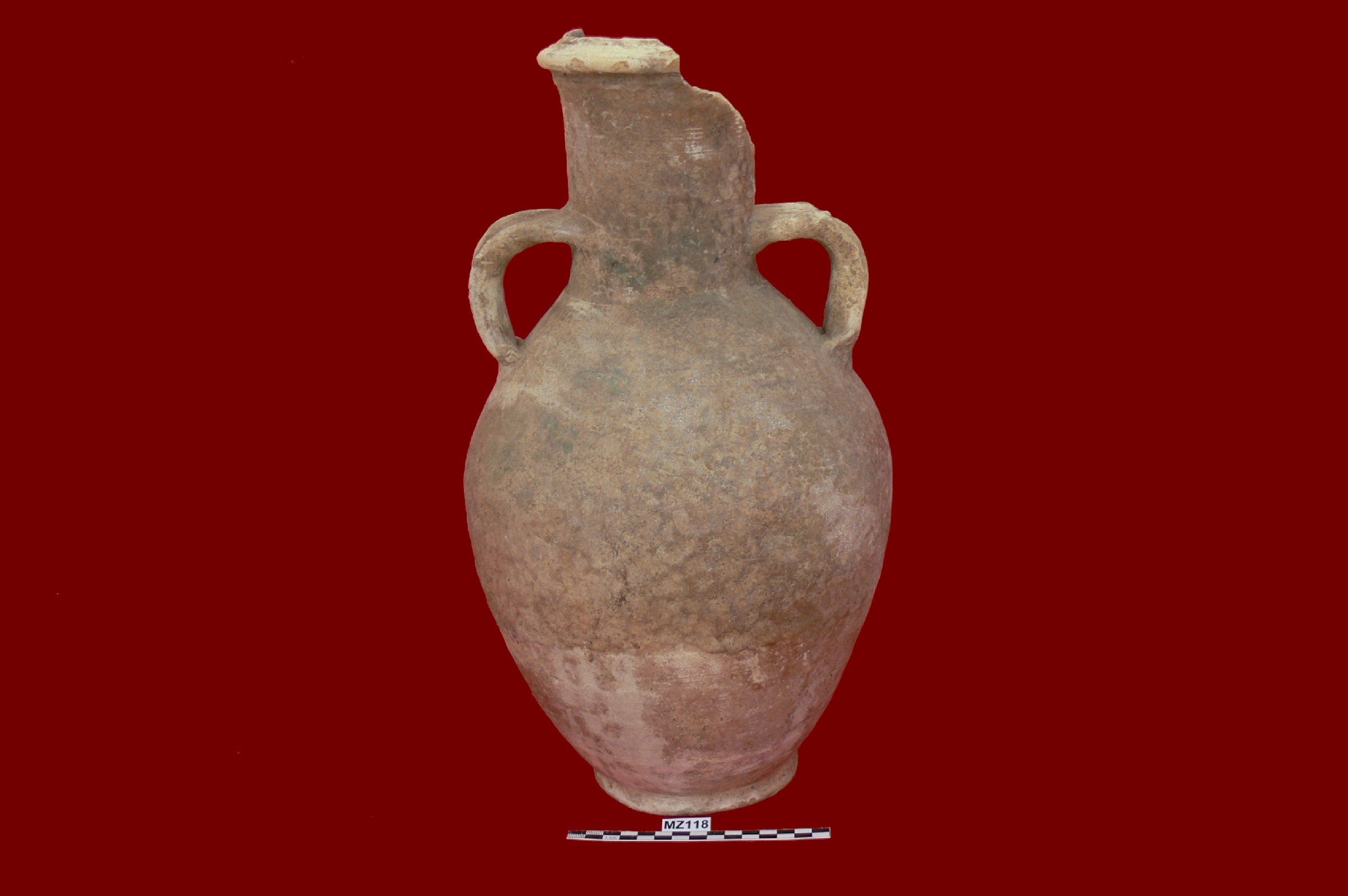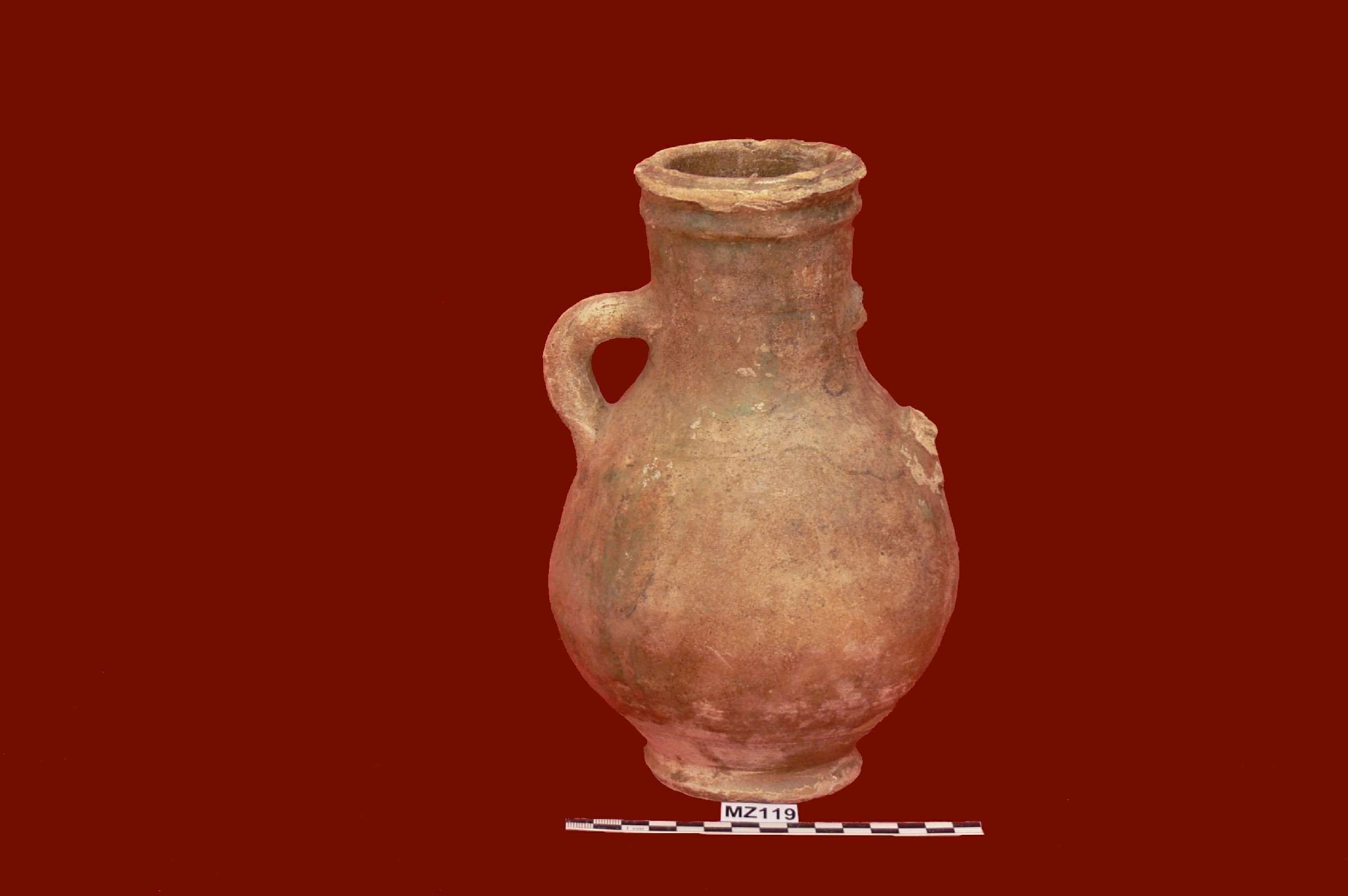 قطعه من الفخار المزجج عباره عن انيه بدنها مستدير يتسع من الوسط ويضيق من الاسفل والاعلى يعلوه عنق اسطواني ينتهي بحافه دائريه عليها خطوط بارزه .يرتكزعلى قاعده دائريه صغيره ,على البدين مقبضين نافذان يتصلان بالعنق احدهم مكسور ومفقود على القطعه تقشر عند الحافه