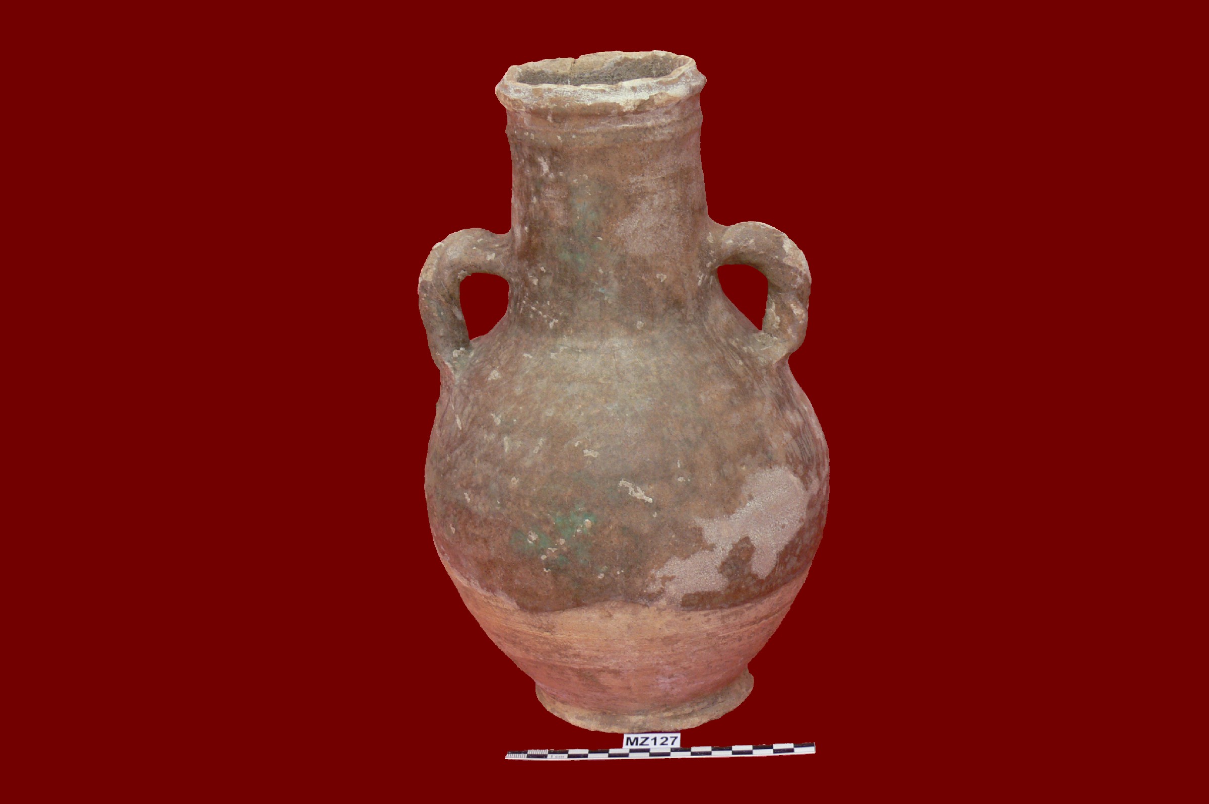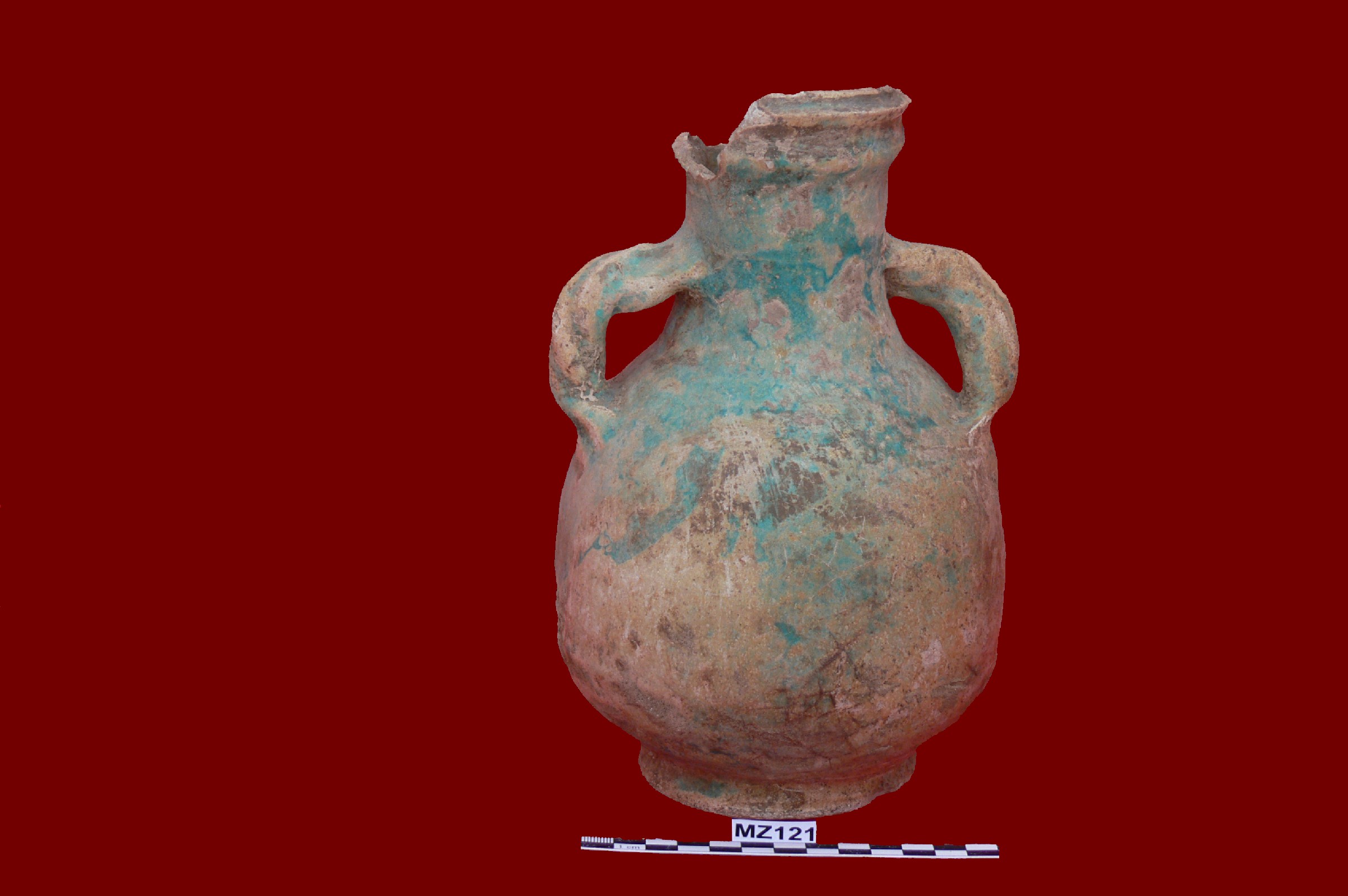 قطعه من الفخار المزجج عباره عن انيه بدنها مستدير يضيق قليلا من الاعلى يعلوه عنق اسطواني ذات حافه دائريه مكسوره من المنتصف حتى العنق ومفقود ,على الحافه زخرفه عباره عن بروزان دائريان .يرتكز البدن على قاعده دائريه صغيره ,على البدن مقبضان نافذان يتصلان بالعنق