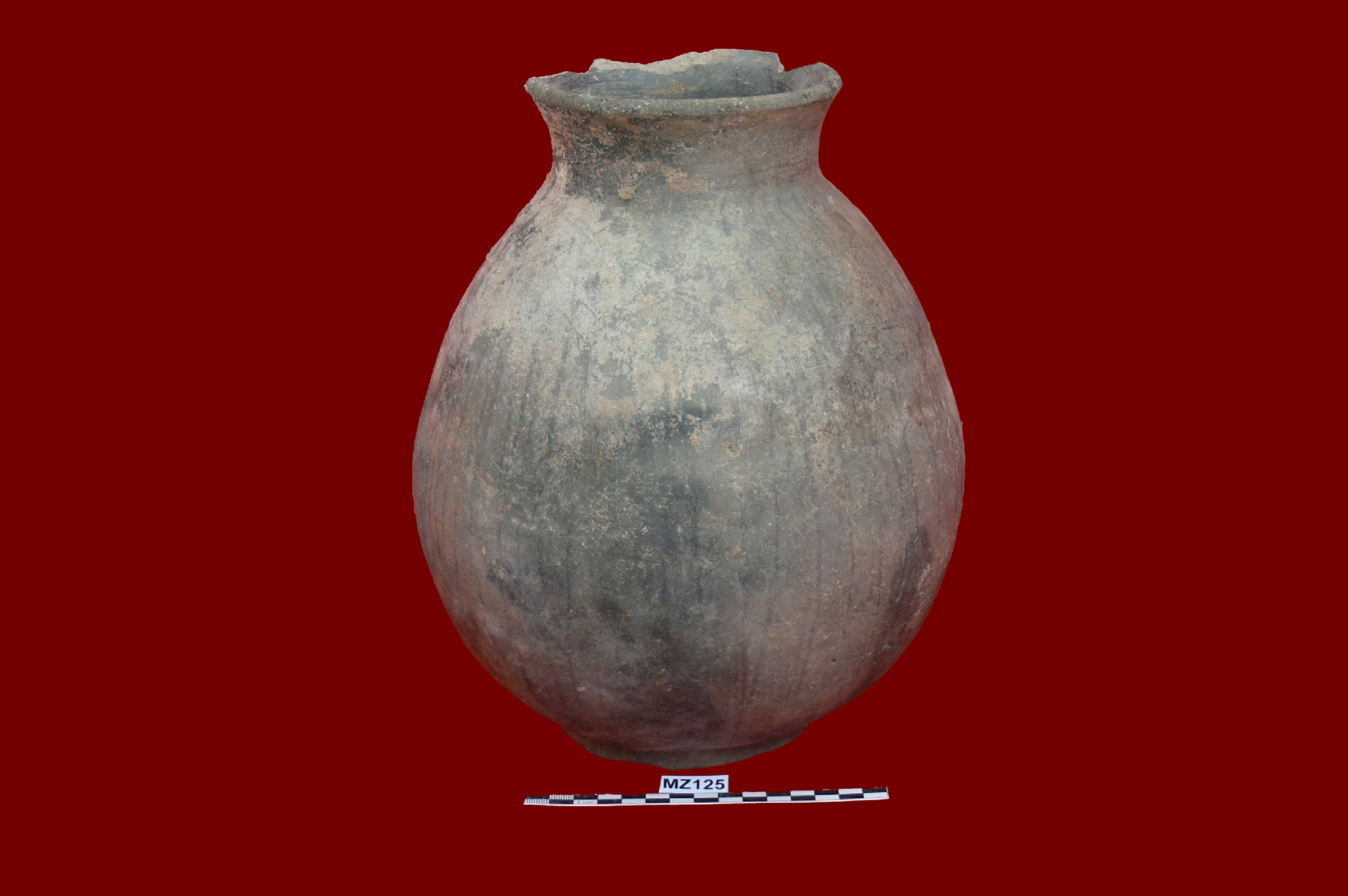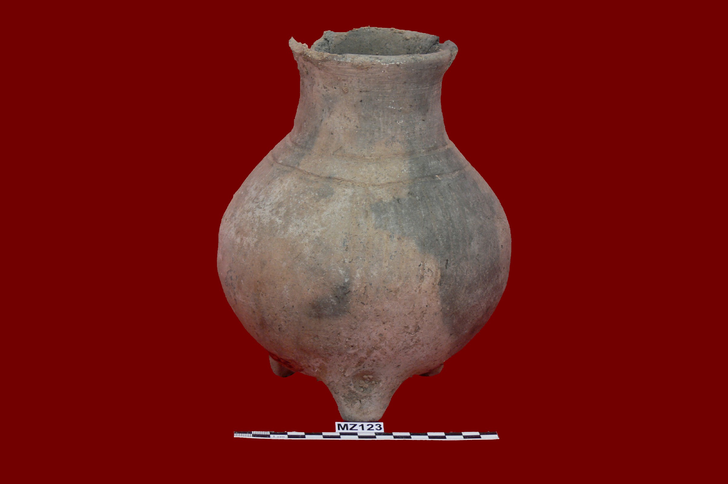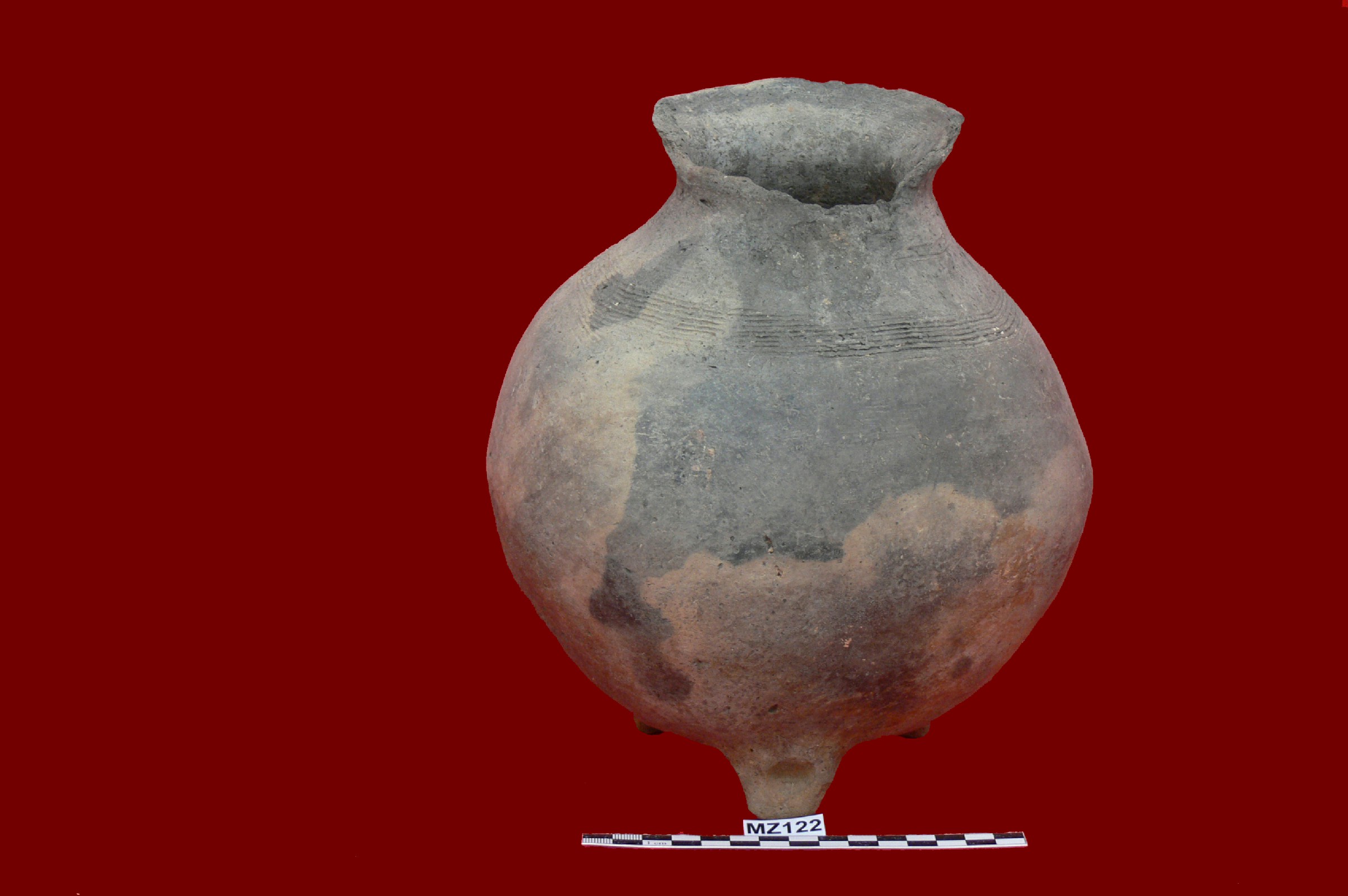 قطعه من الفخار عباره عن انيه ذات بدن كروي ينتهي البدن بعنق اسطواني وحافه تبرز قليلا الى الخارج ,الحافه متاكله وبها كسر اعيد ترميمه اسفل العنق خطين محزوزين تلتف حول العنق ,على البدن زخرفه عباره عن خطوط طوليه ,يرتكز البدن على ثلاث قوائم في وسط كل قائم حفر م