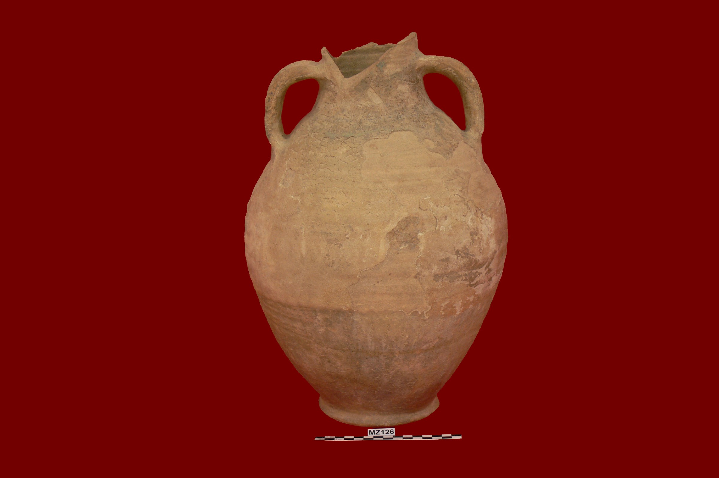قطعه من الفخار عباره عن انيه بدنها منتفخ في الوسط ويضيق في اسفله وقليلا في الاعلى ,للانيه عنق اسطواني , الفوهه وجزء من العنق مكسور ومفقود ,للانيه مقبضين مقوسه تمتد من اعلى البدن وحتى منتصف العنق , يرتكز البدن على قاعده مستديره مسطحه عليها كسور ومفقوده ,