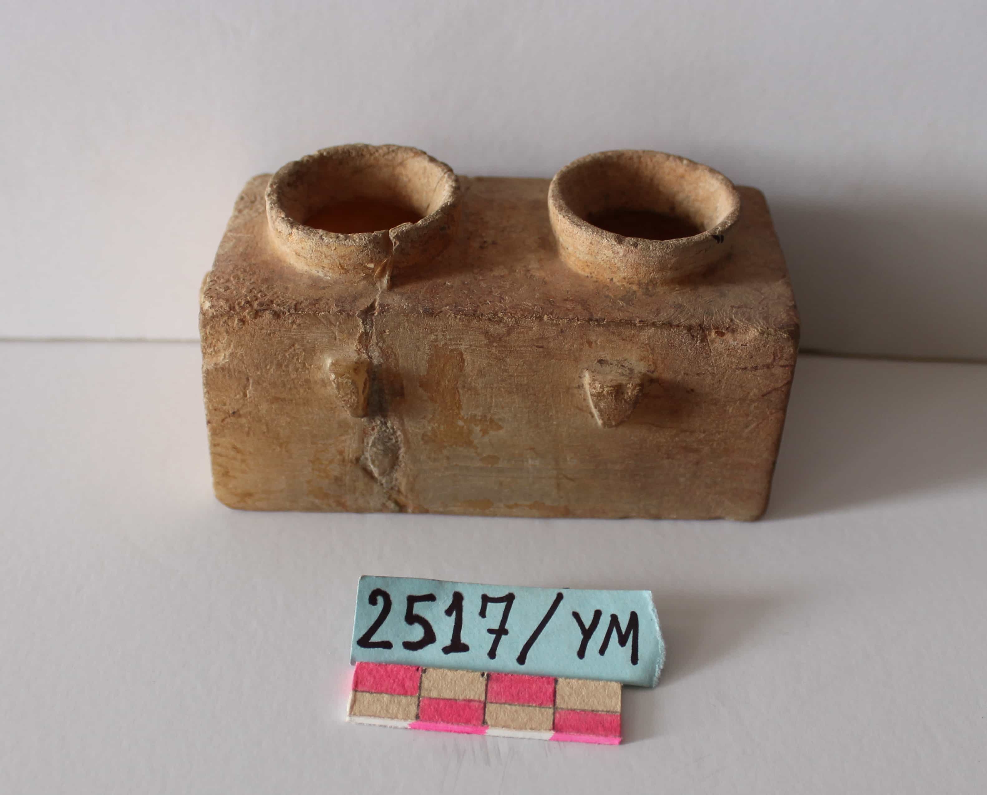 آنية من الرخام مستطيلة الشكل ذات أربعة جوانب لها فوهتان وعليها أربعة بروزات
