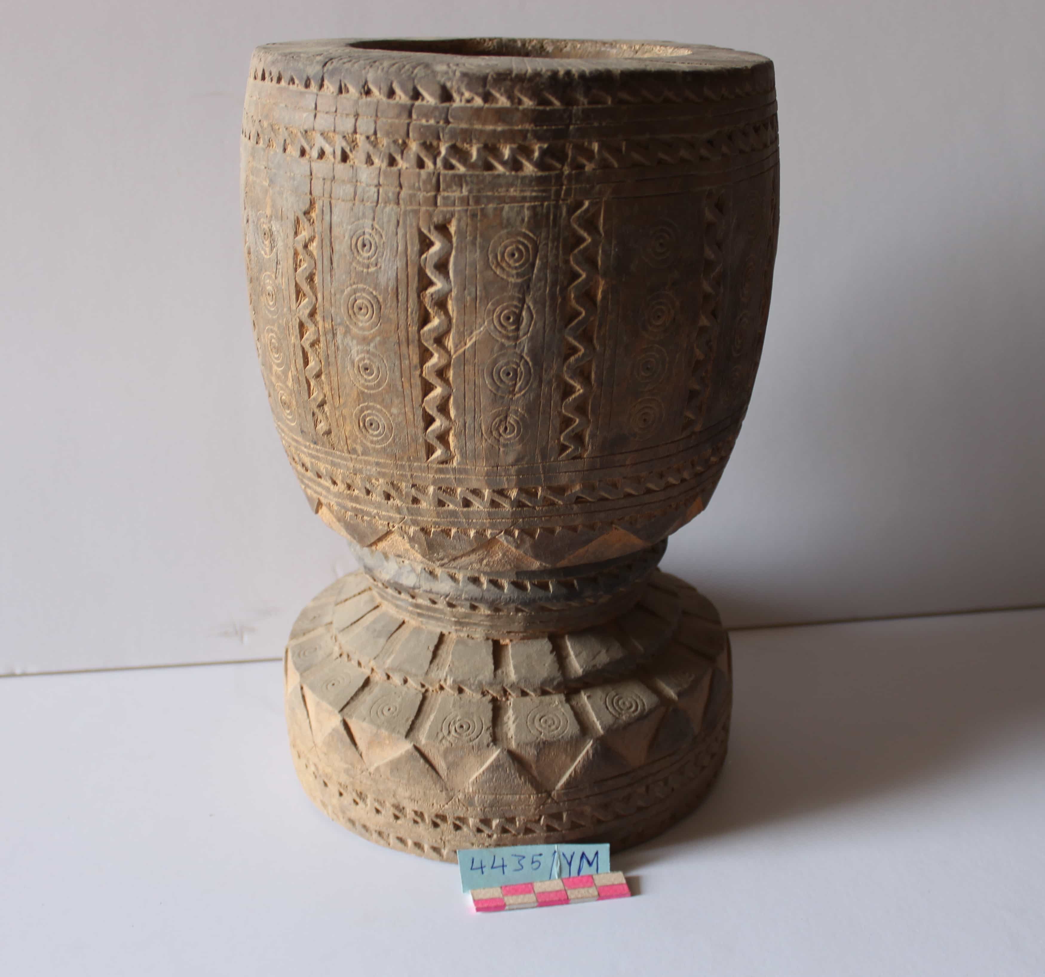 أنية من الفخار كروية الشكل على البدن نحت لثعبان بارز