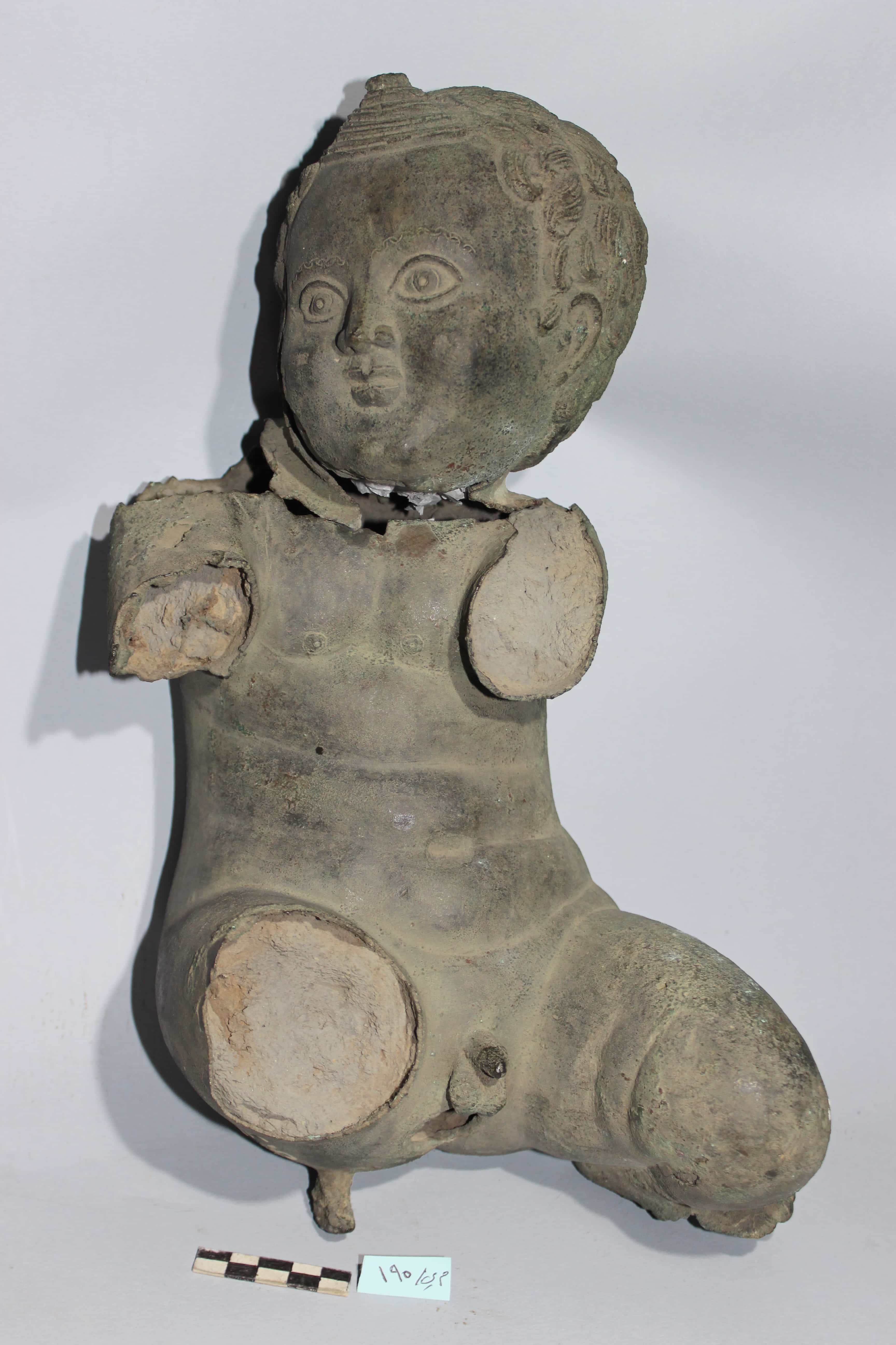 تمثال لطفل من البرونز جالس مكسور الى جزئين الأرجل والأيدي مكسورة ومفقودة