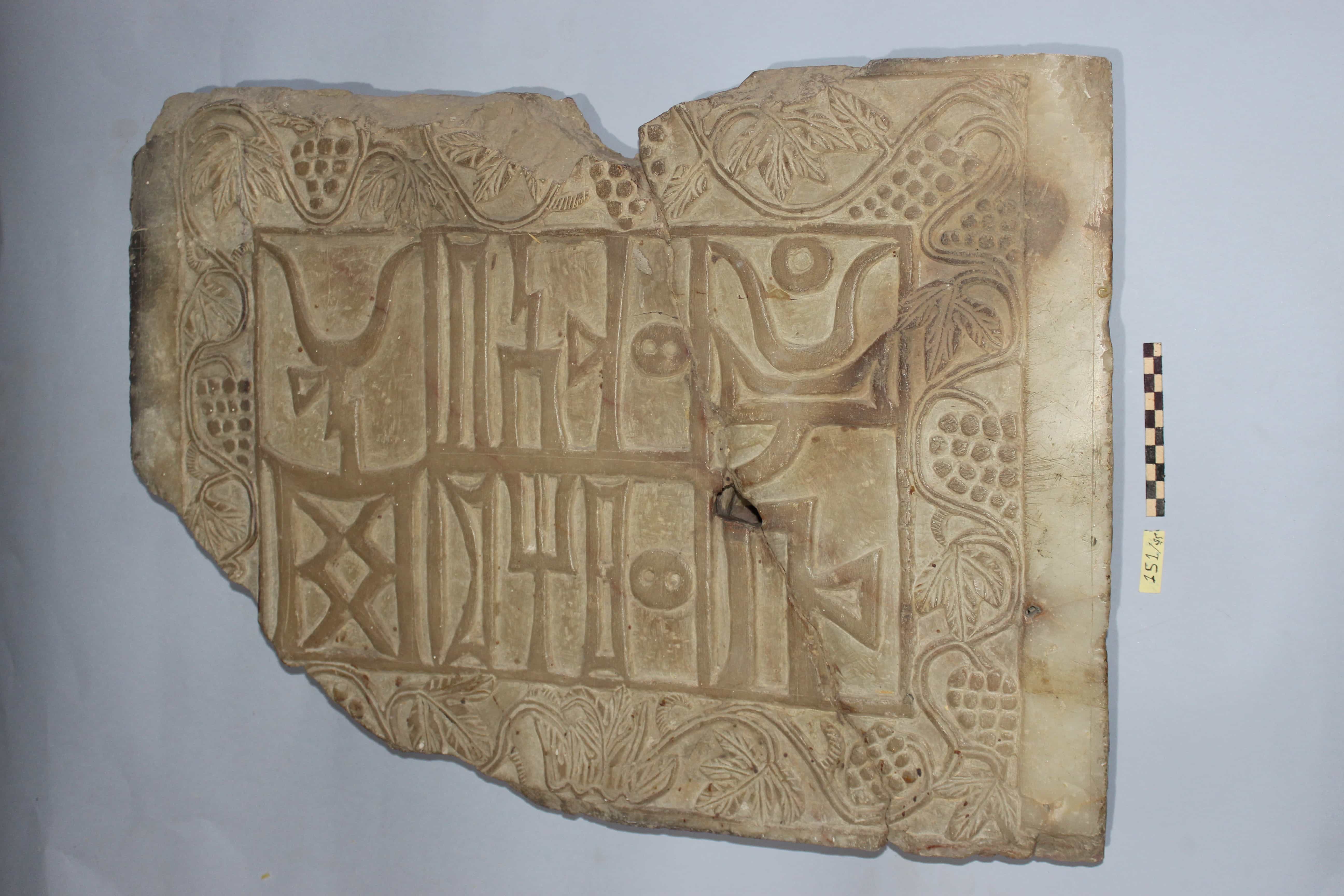 لوحة من الرخام عليها نقش بخط المسند وزخارف نباتية