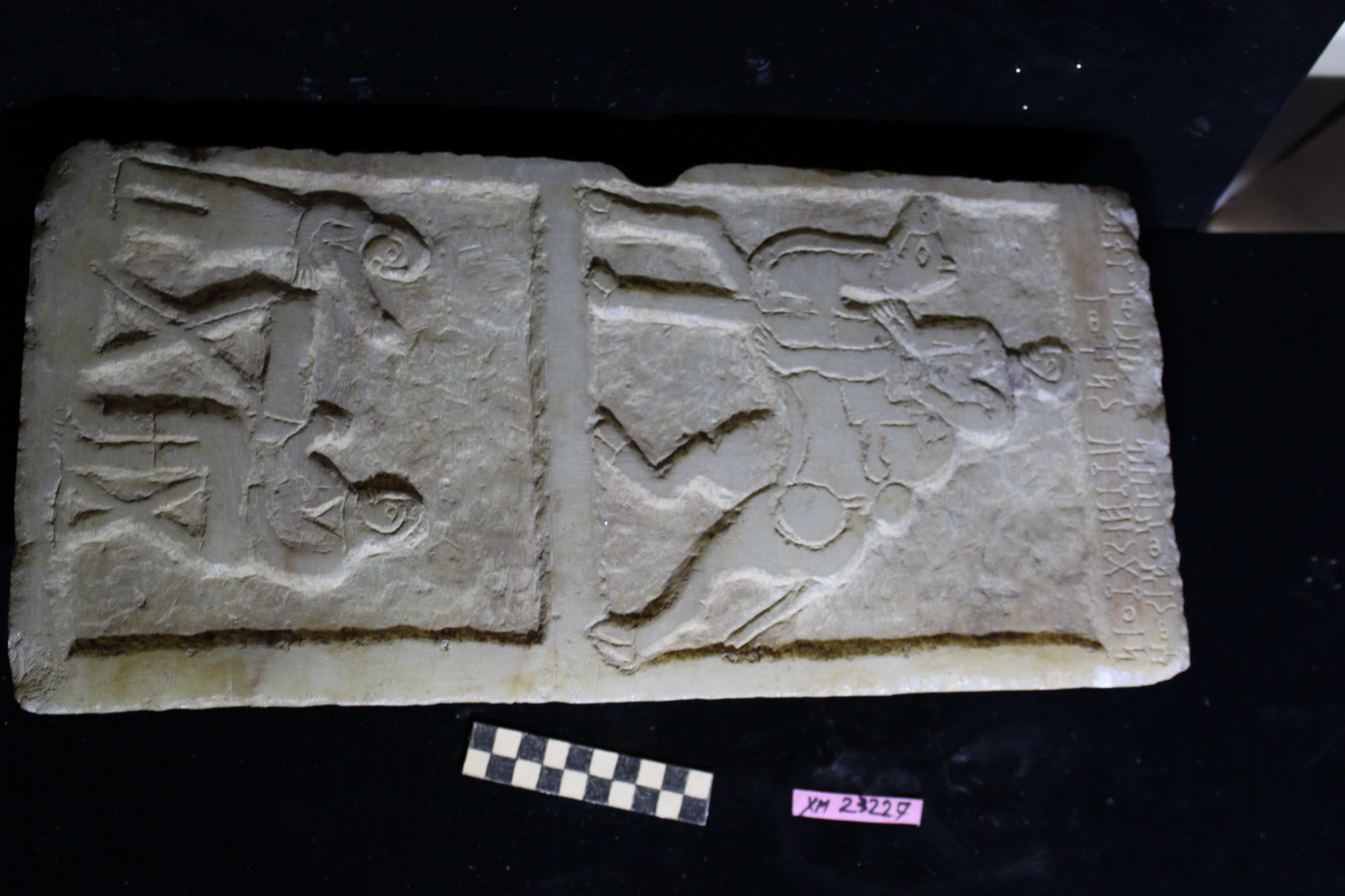 لوحة من الحجر الجيري عليها رسوم آدمية وحيوانية ونقش بخط المسند
