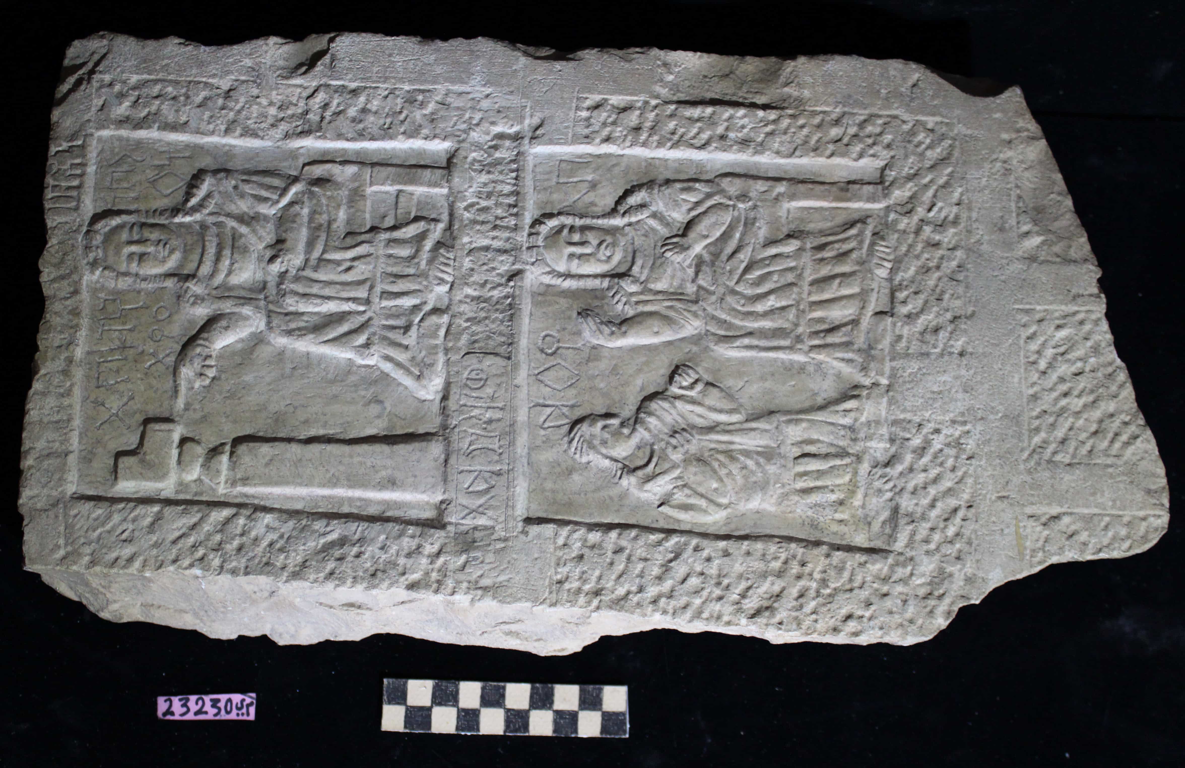 لوحة من الحجر الجيري عليها رسوم آدمية ونقش مكون من سطر واحد بخط المسند