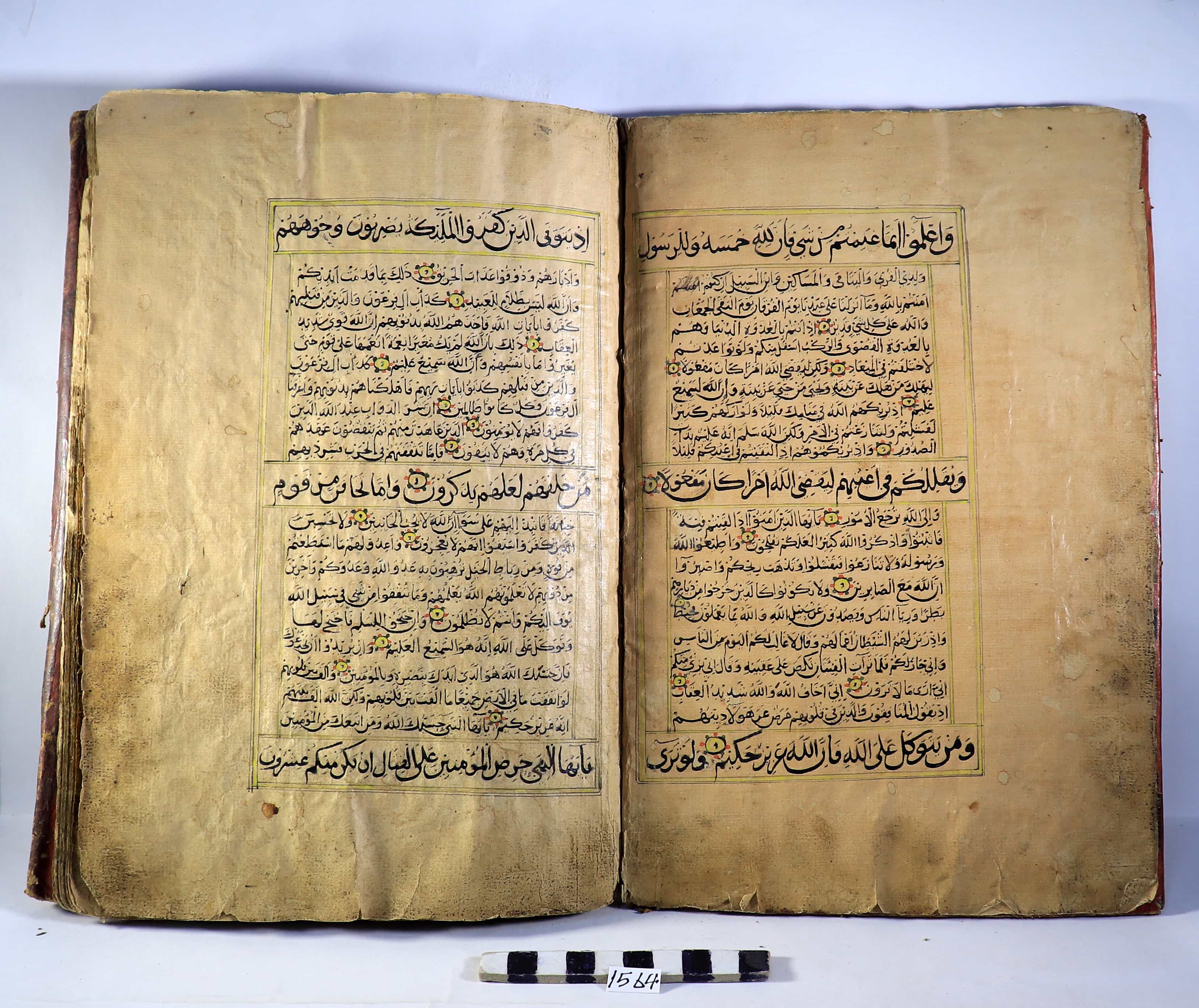 المصحف الكريم بيداء من قوله تعالى ( واعلموا انما غنمتم من شي فان لله خمس .... الخ ) وينتهي عند قوله تعالى ( وان الله لا يهدي كيد الخائنين ) له غلاف من الجلد وله لسان ، في بدايته وقف مؤرخ في سنة 1285