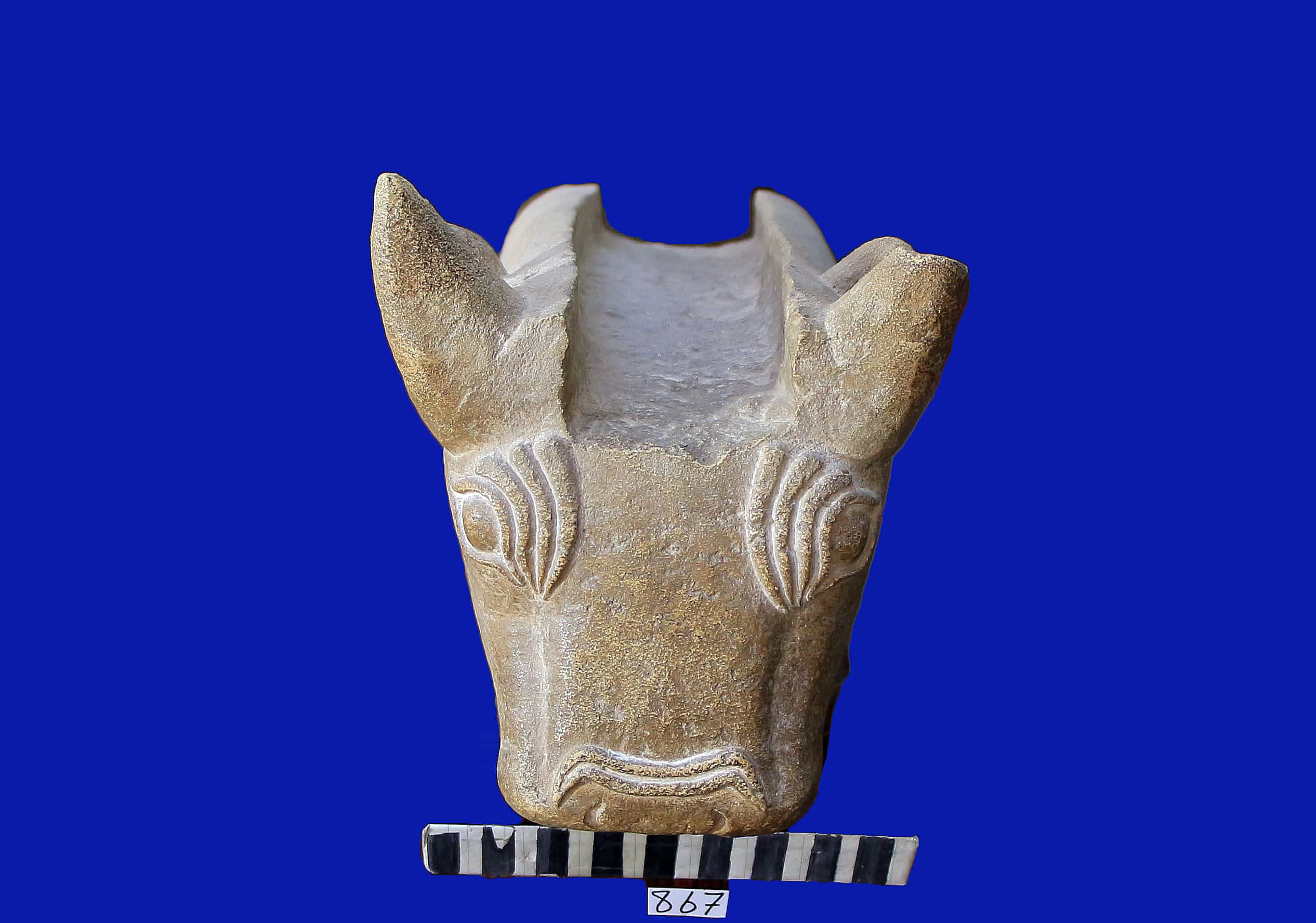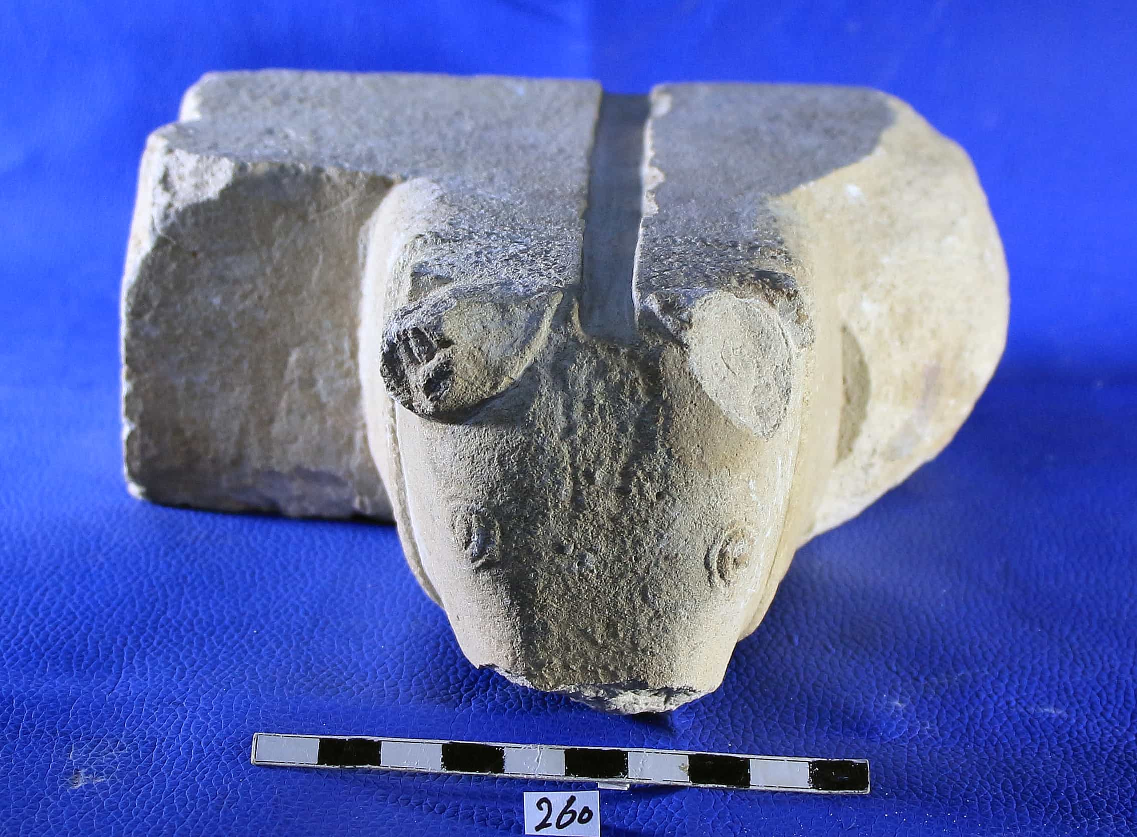 مقدمة مذبح واجهته راس ثور . القرن الايسر مشطوف القرن الأيمن مرمم وملامح الوجه مكتملة وواضحة