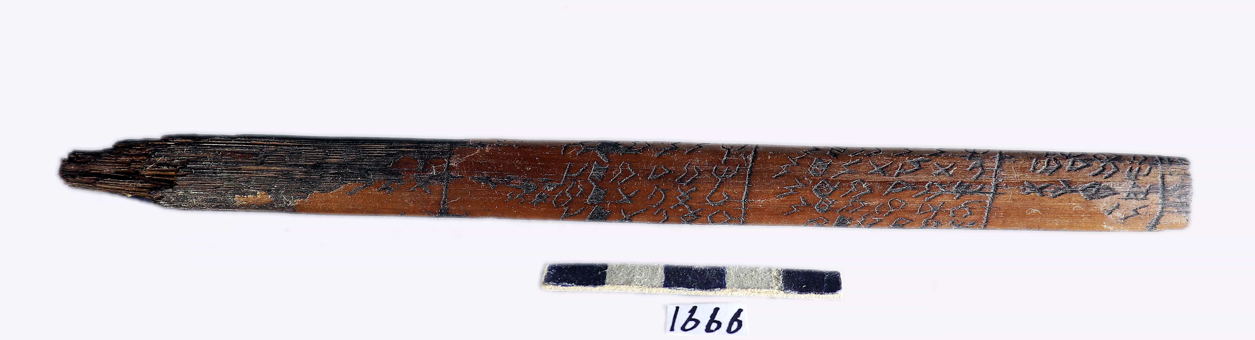 عود من عسب النخيل عليه ثلاثة اسطر بخط الزبور اسطواني الشكل